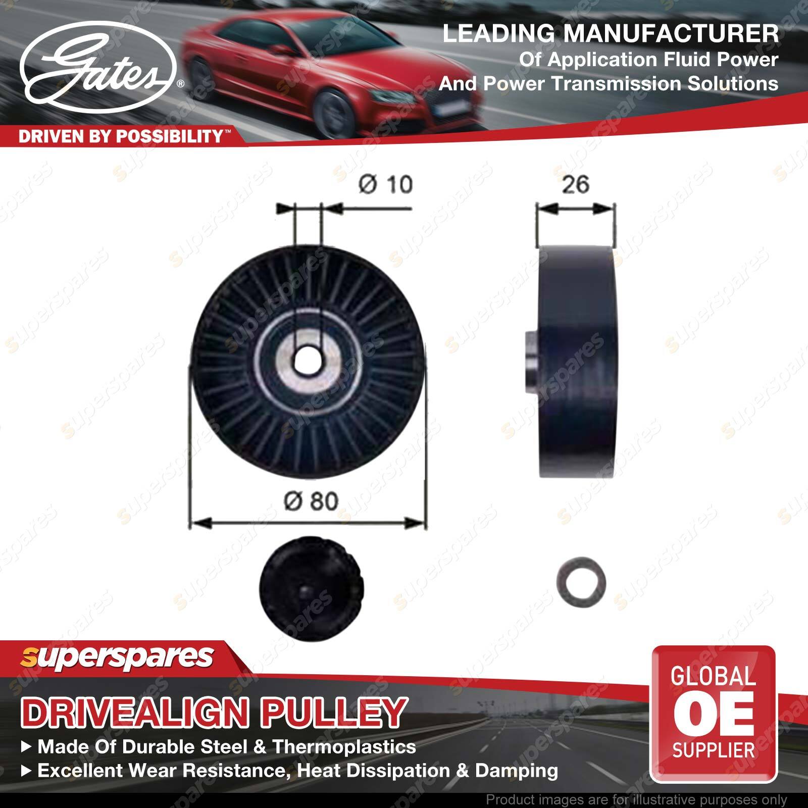 Gates DriveAlign idlers & pulleys provide OE-Quality fit to passenger cars and light trucks, performing as a locked center tensioning pulley, an automatic belt tensioner pulley, or an idler pulley. Gates idler pulleys reduce wear, vibration, and friction on belts, thereby extending belt service life OE-Quality fit to virtually every domestic or import vehicle on the road today. Engineered to exceed demanding OEM requirements. In laboratory tests, under extreme peak-to-peak vibration and contamination tests, driveAlign heavy-duty tensioners lasted up to three times longer than competitive aftermarket tensioners. | ![]() |