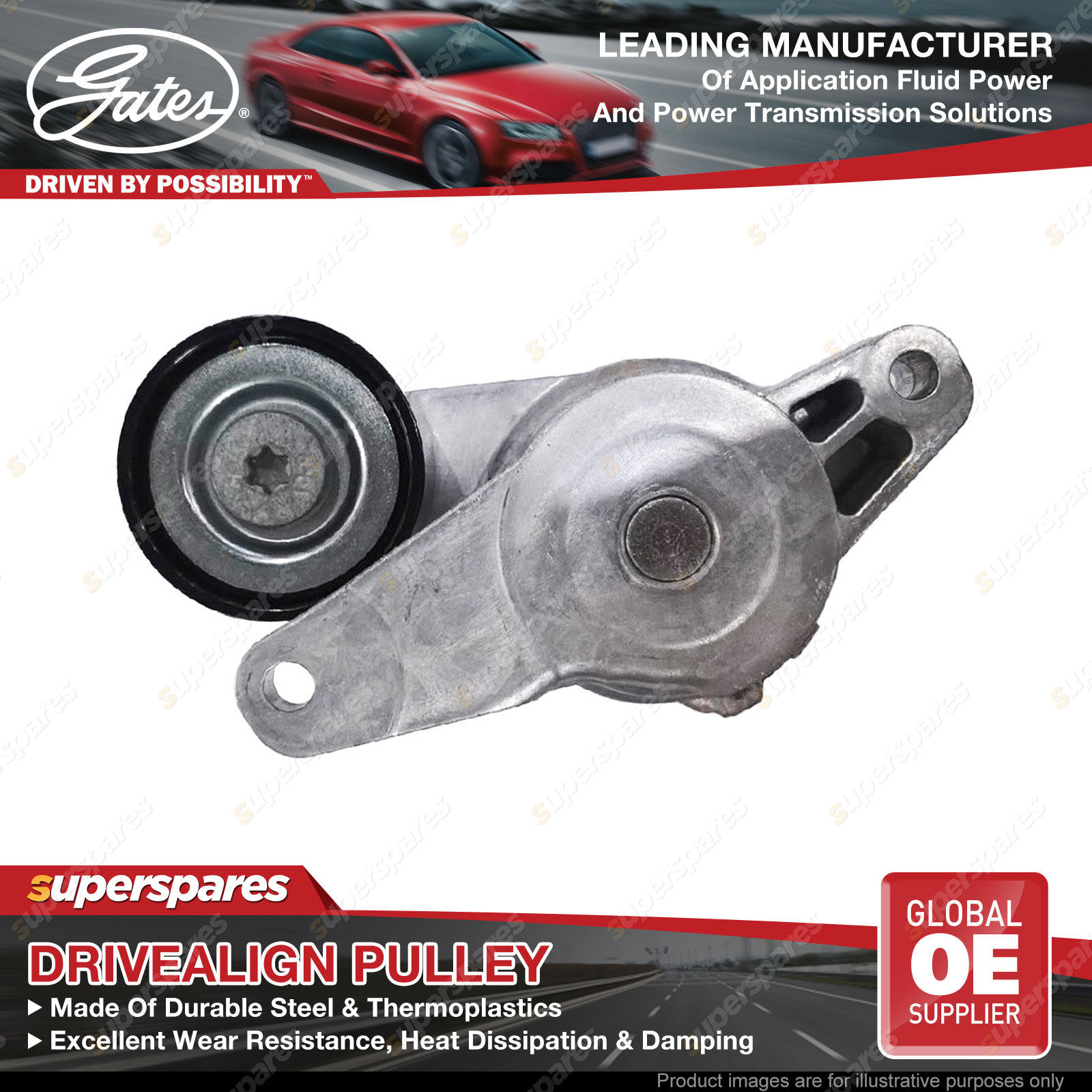 Gates DriveAlign idlers & pulleys provide OE-Quality fit to passenger cars and light trucks, performing as a locked center tensioning pulley, an automatic belt tensioner pulley, or an idler pulley. Gates idler pulleys reduce wear, vibration, and friction on belts, thereby extending belt service life OE-Quality fit to virtually every domestic or import vehicle on the road today. Engineered to exceed demanding OEM requirements. In laboratory tests, under extreme peak-to-peak vibration and contamination tests, driveAlign heavy-duty tensioners lasted up to three times longer than competitive aftermarket tensioners. | ![]() |