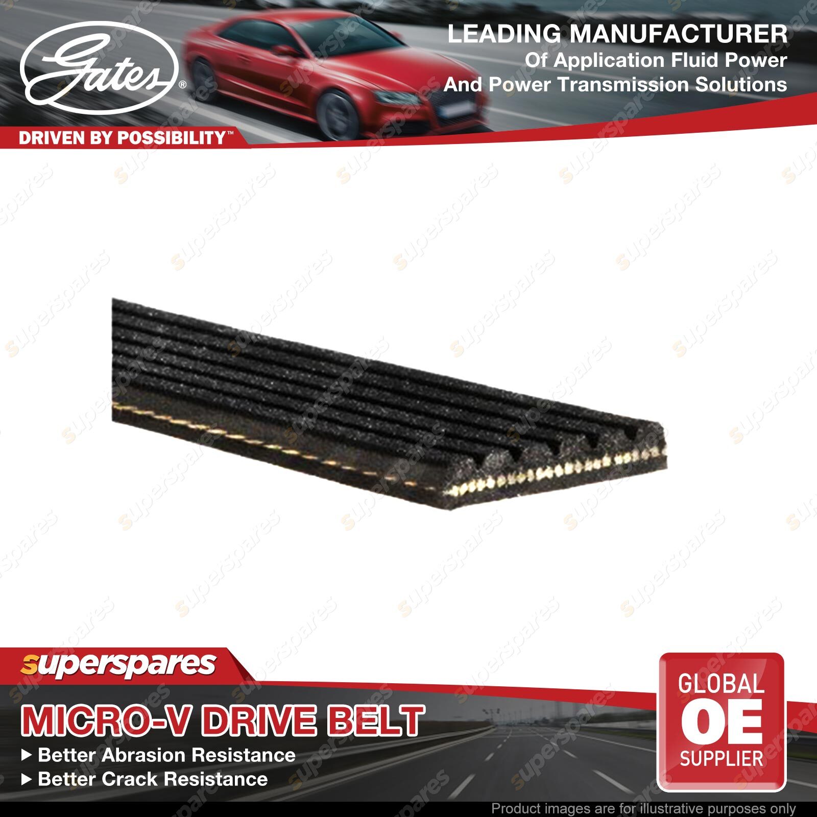 Gates Micro-V Ribbed Belts are an ideal replacement for original belts on serpentine drives and other multi-ribbed belt applications.Designed for small diameter pulleys, backside idlers, and for use with (or without) automotive tensioners.The advanced belt constructions used in these belts help to eliminate belt noise, reduce tension loss and solve problem drive applications.The special tensile members and fibre-loaded reinforcement of ribs used in Gates micro-v belts, aid in added wear and crack resistance. | ![]() |