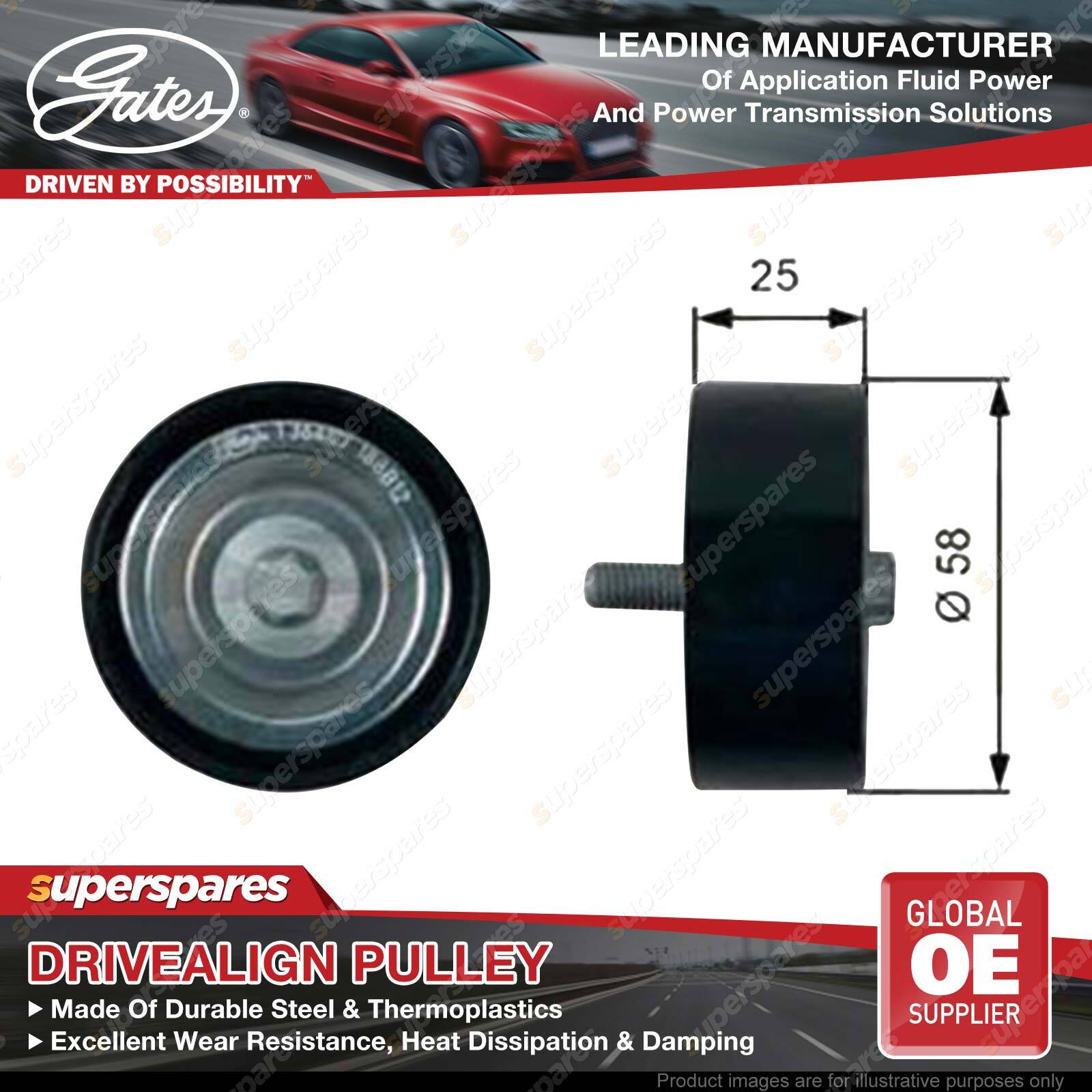 Gates DriveAlign idlers & pulleys provide OE-Quality fit to passenger cars and light trucks, performing as a locked center tensioning pulley, an automatic belt tensioner pulley, or an idler pulley. Gates idler pulleys reduce wear, vibration, and friction on belts, thereby extending belt service life OE-Quality fit to virtually every domestic or import vehicle on the road today. Engineered to exceed demanding OEM requirements. In laboratory tests, under extreme peak-to-peak vibration and contamination tests, driveAlign heavy-duty tensioners lasted up to three times longer than competitive aftermarket tensioners. | ![]() |