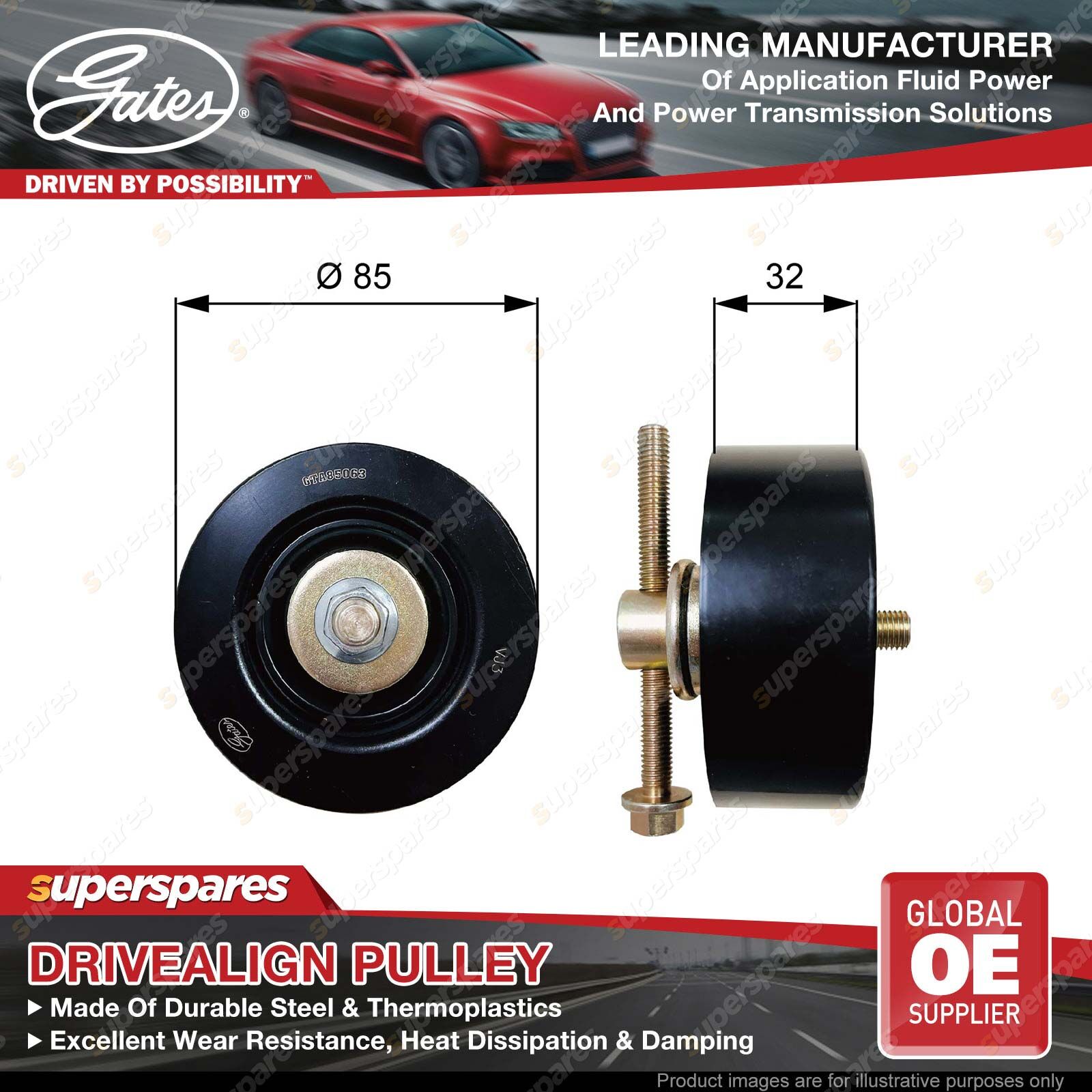Gates DriveAlign idlers & pulleys provide OE-Quality fit to passenger cars and light trucks, performing as a locked center tensioning pulley, an automatic belt tensioner pulley, or an idler pulley. Gates idler pulleys reduce wear, vibration, and friction on belts, thereby extending belt service life OE-Quality fit to virtually every domestic or import vehicle on the road today. Engineered to exceed demanding OEM requirements. In laboratory tests, under extreme peak-to-peak vibration and contamination tests, driveAlign heavy-duty tensioners lasted up to three times longer than competitive aftermarket tensioners. | ![]() |