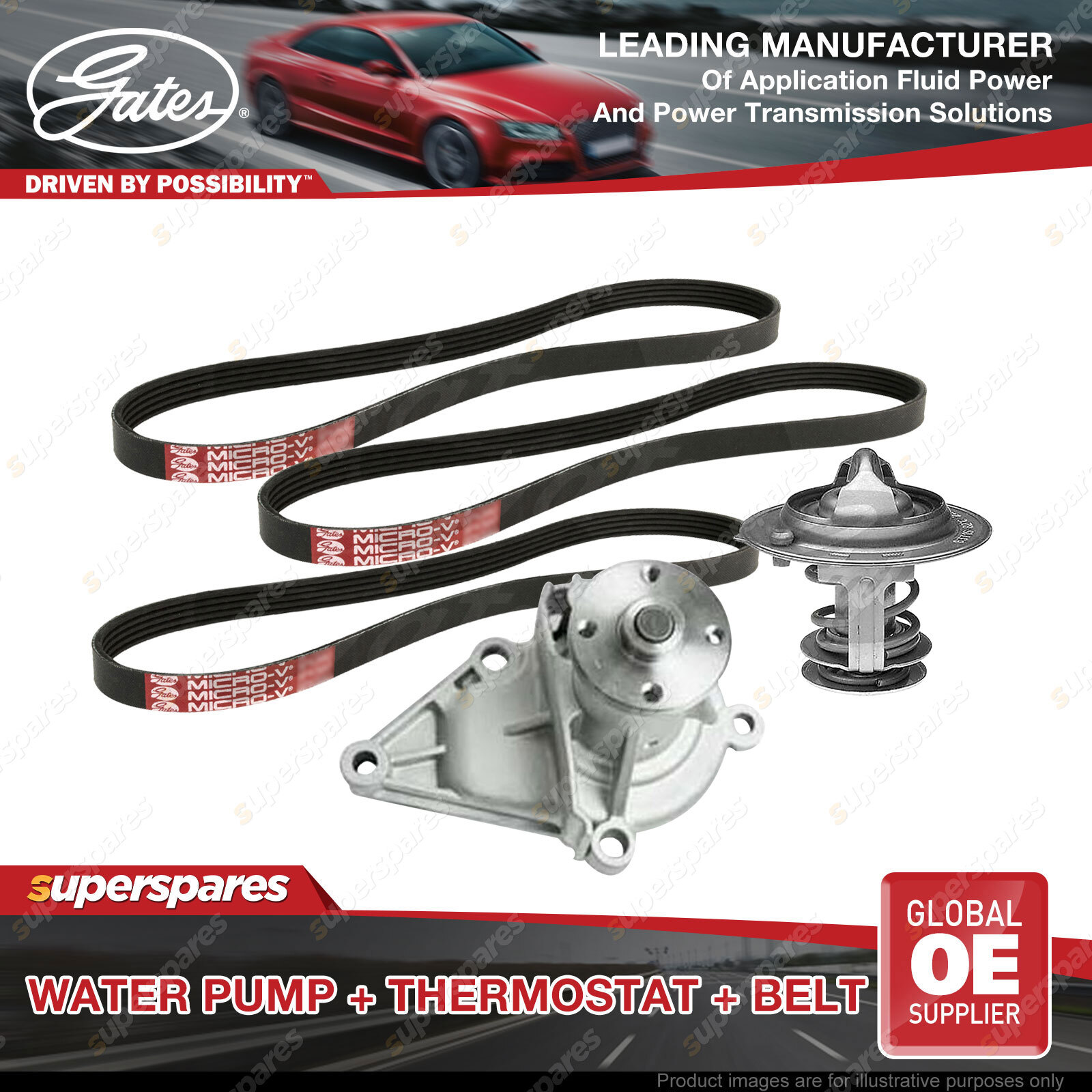 Contents : Gates Water Pump + Thermostat + Drive Belt Kit