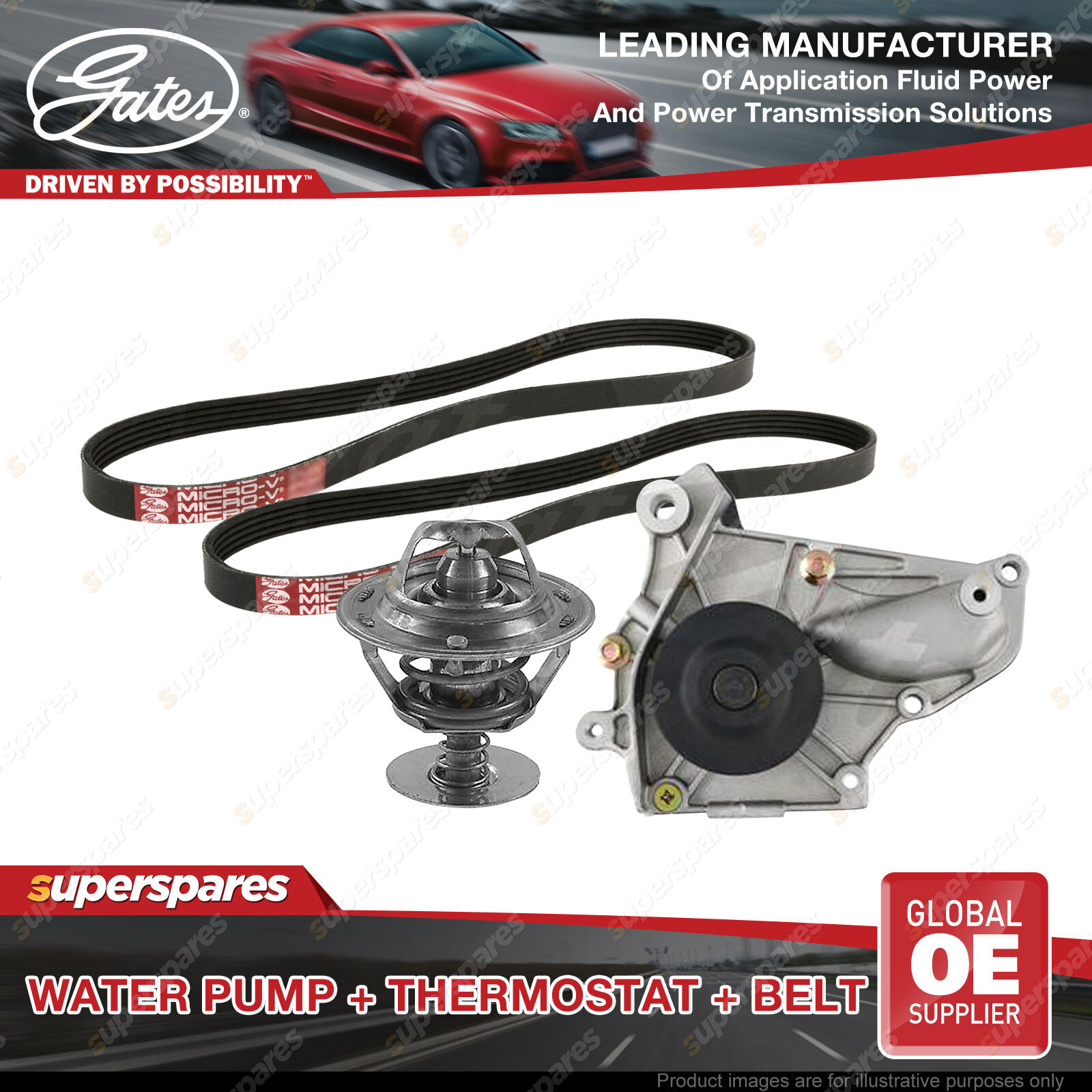 Contents : Gates Water Pump + Thermostat + Drive Belt Kit
