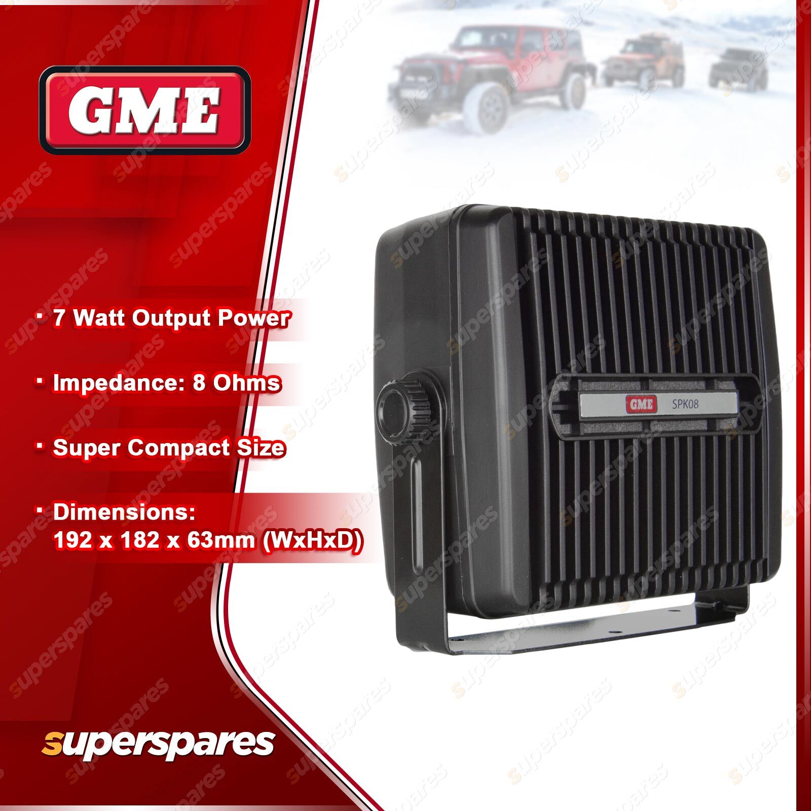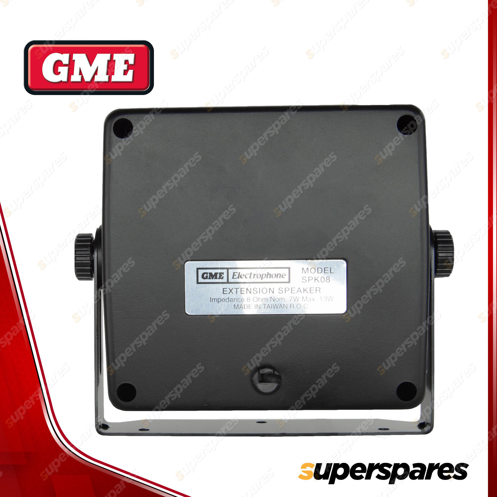 ![]() | For over 60 years GME has designed and manufactured an extensive range of high quality accessories to suit a wide variety of applications. From 4WDing to Boating and Fishing, GME has a genuine accessory to meet every need. The SPK08 is an extension speaker to suit a wide range of GME radios to enhance the audio experience in noisy environments, ensuring important calls are never missed. With 7 Watts of output power and a super compact size this extension speaker is the ideal solution for installations where space is limited. Supplied with lead, plug, mounting bracket and mounting hardware. |
