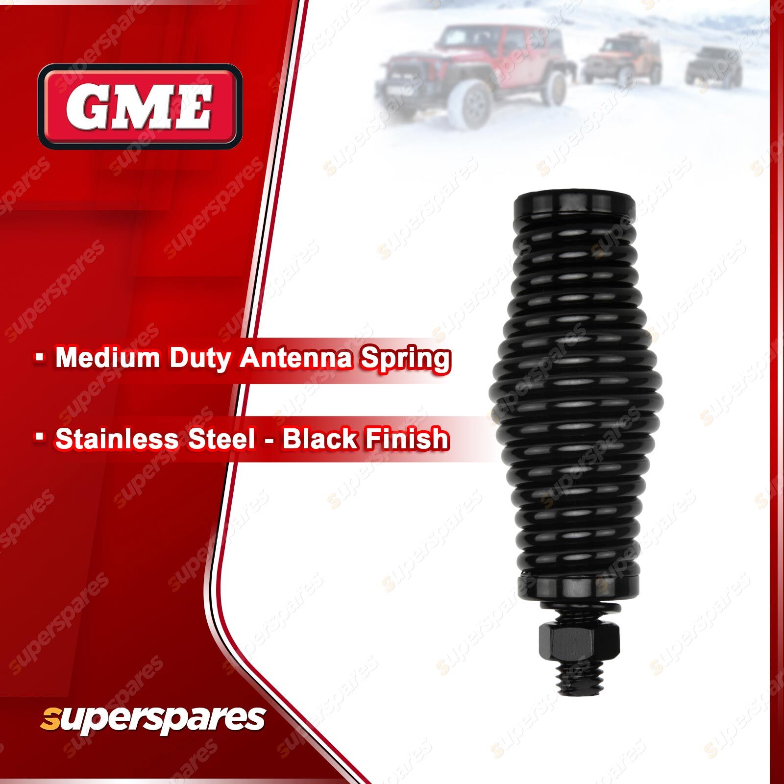 ![]() | For over 60 years GME has designed and manufactured an extensive range of high quality accessories to suit a wide variety of applications. From 4WDing to Boating and Fishing, GME has a genuine accessory to meet every need. Stainless Steel Antenna Spring to suit AE-SS4702B - Black |