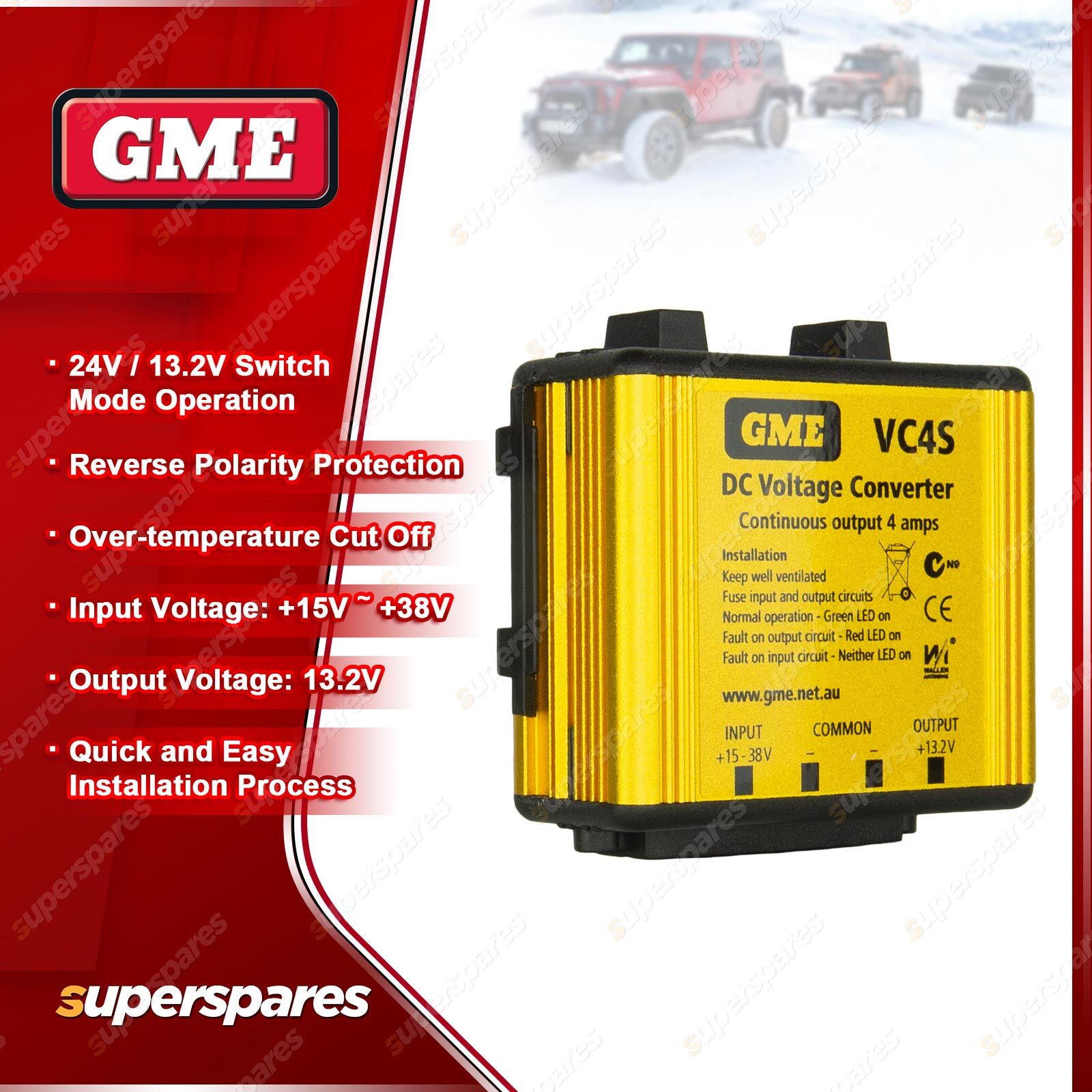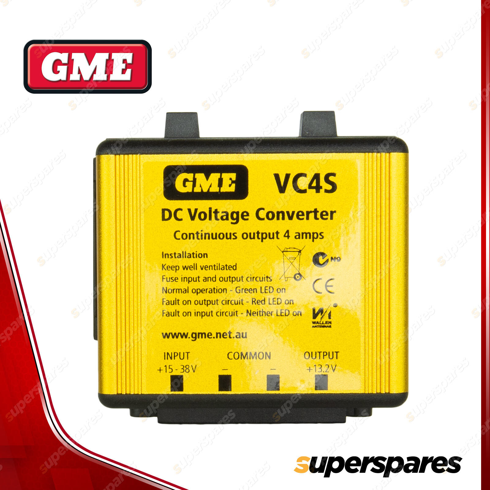 ![]() | For over 60 years GME has designed and manufactured an extensive range of high quality accessories to suit a wide variety of applications. From 4WDing to Boating and Fishing, GME has a genuine accessory to meet every need. 24V / 12V DC Voltage converter, designed for UHF CB radio installations in heavy vehicles and plant equipment. Featuring reverse polarity protection and over-temperature cut off. |