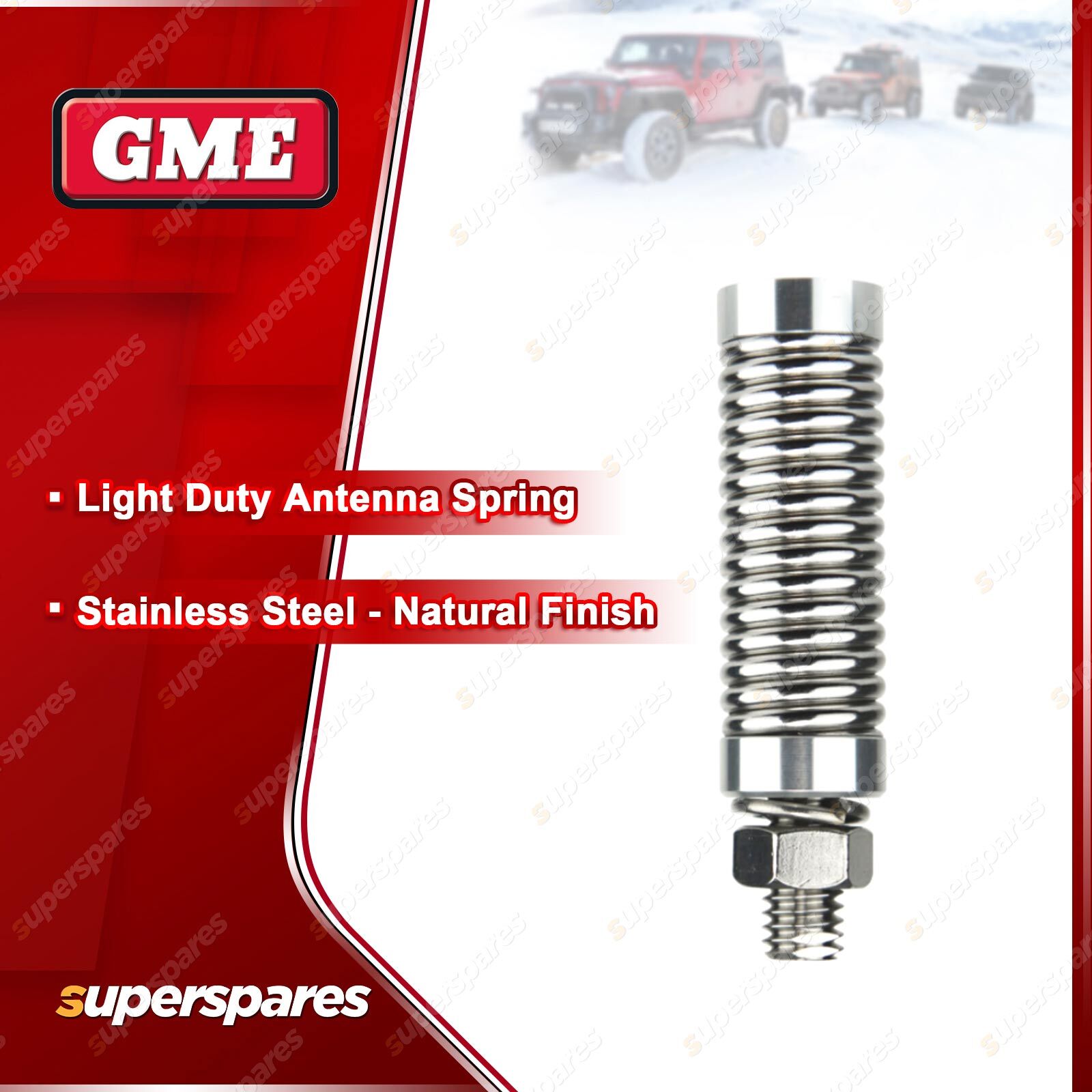 ![]() | For over 60 years GME has designed and manufactured an extensive range of high quality accessories to suit a wide variety of applications. From 4WDing to Boating and Fishing, GME has a genuine accessory to meet every need. Stainless Steel Antenna Spring to suit AE-SS4701. |