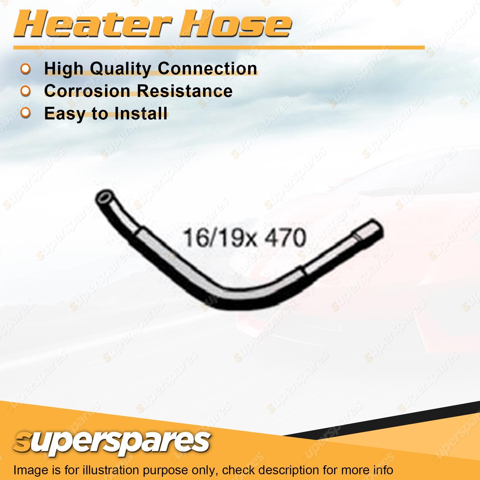 Content : 1 x Heater Hose Brand : Superspares Position : Outlet | Parameter : Length : 470mm Inside Diameter : 16mm Bell Inside Diameter : 19mm |
