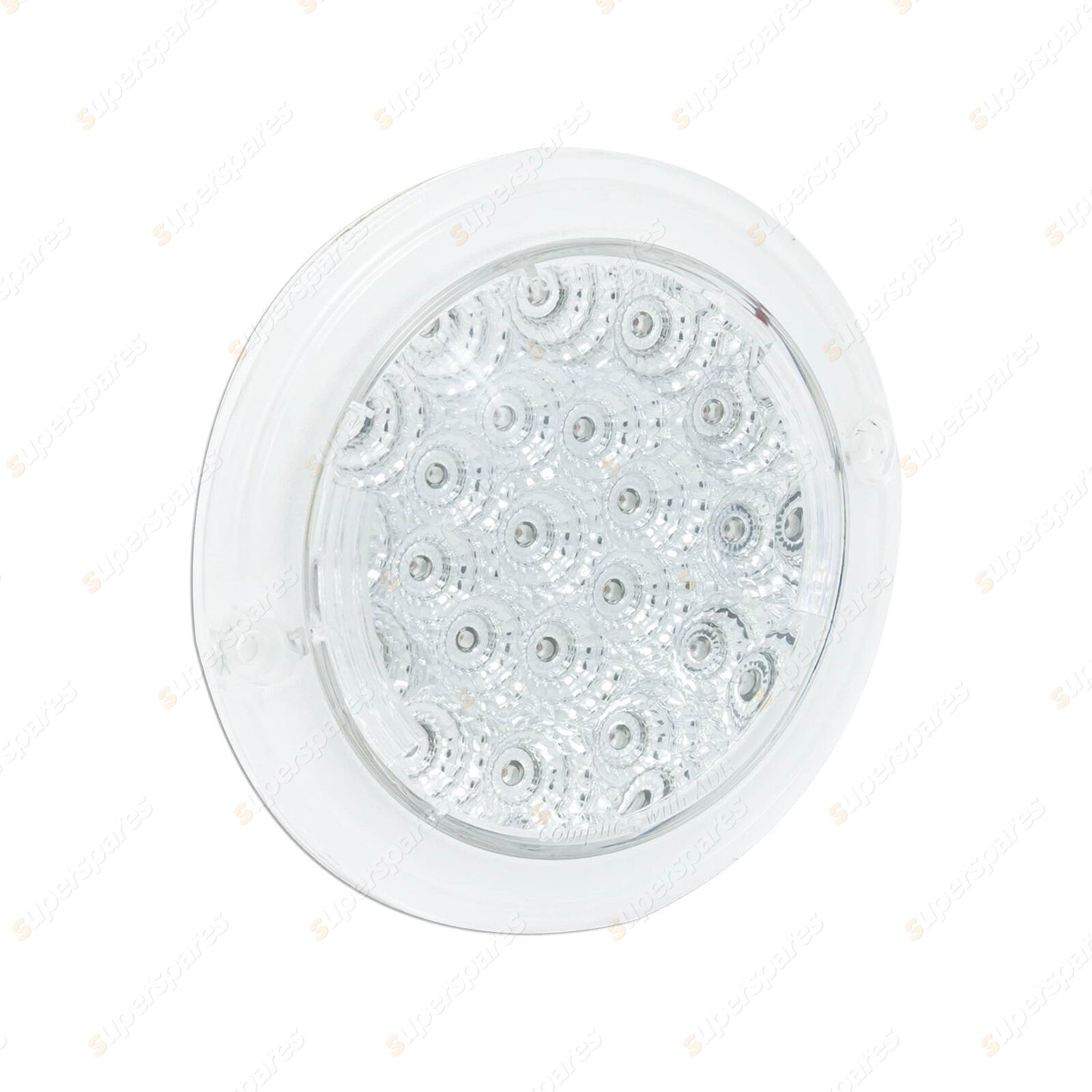 Round Indicator Lamp with Clear lens, 130mm diametre, recessed mount, 12-24 volt, ADR Approved. Blister Pack.