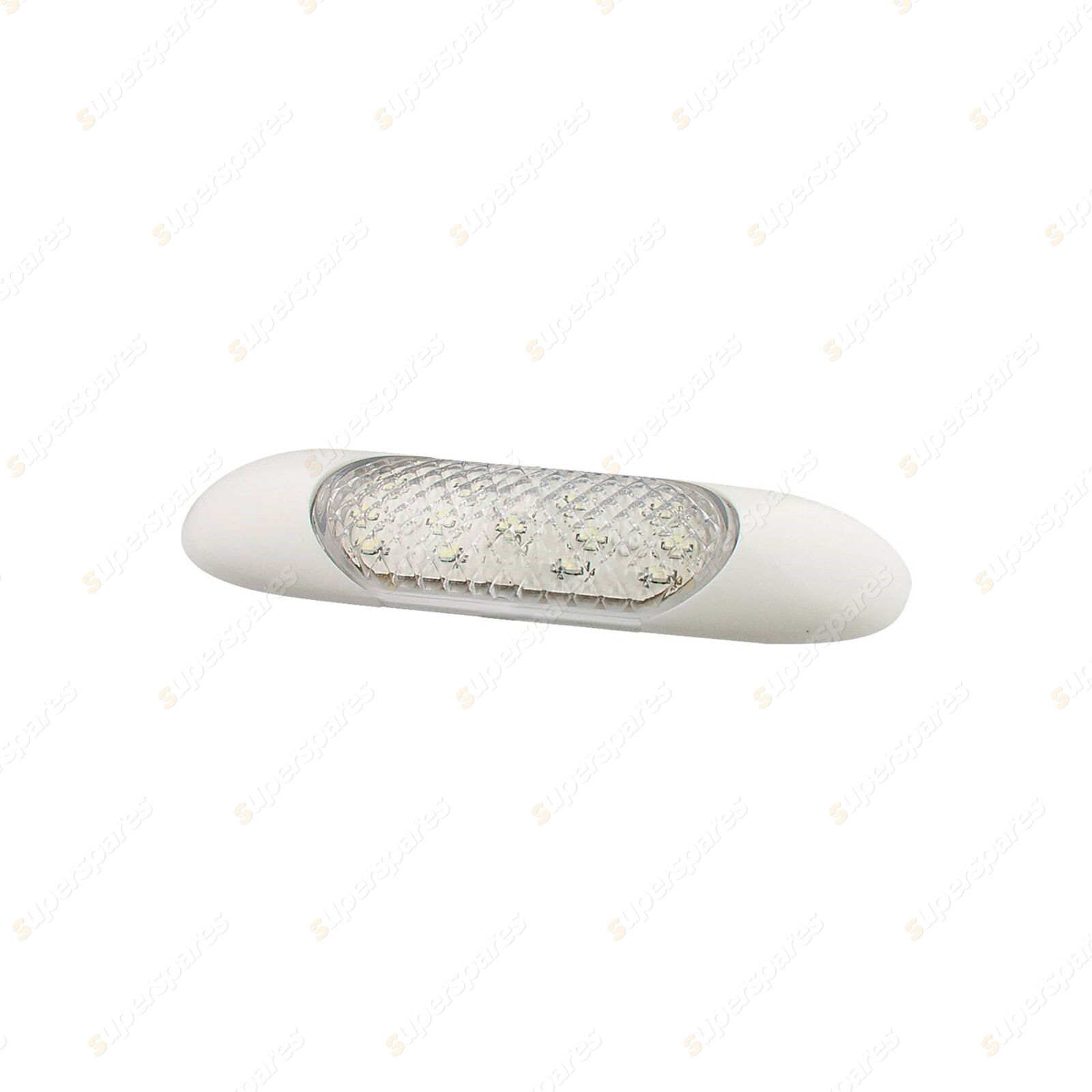 LED interior light. 12 Volt. 16pcs SMD Leds equivalent to 10 watt globe. Clear lens with White frame. 100 x 25 x 10mm. Blister Pack.