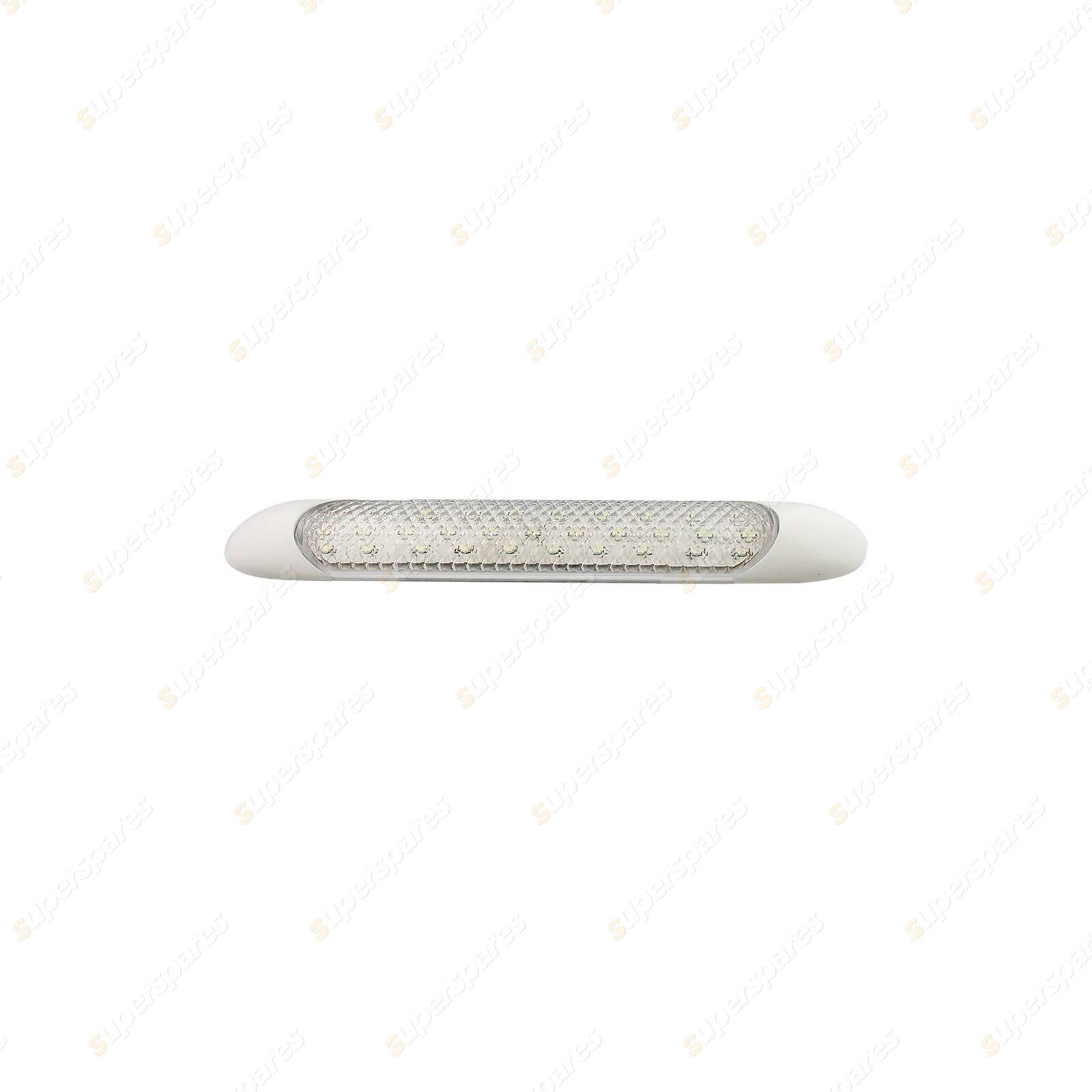 LED interior light. 12 Volt. 31pcs SMD Leds equivalent to 15 watt globe. Clear lens with White frame. 150 x 25 x 10mm. Blister Pack.