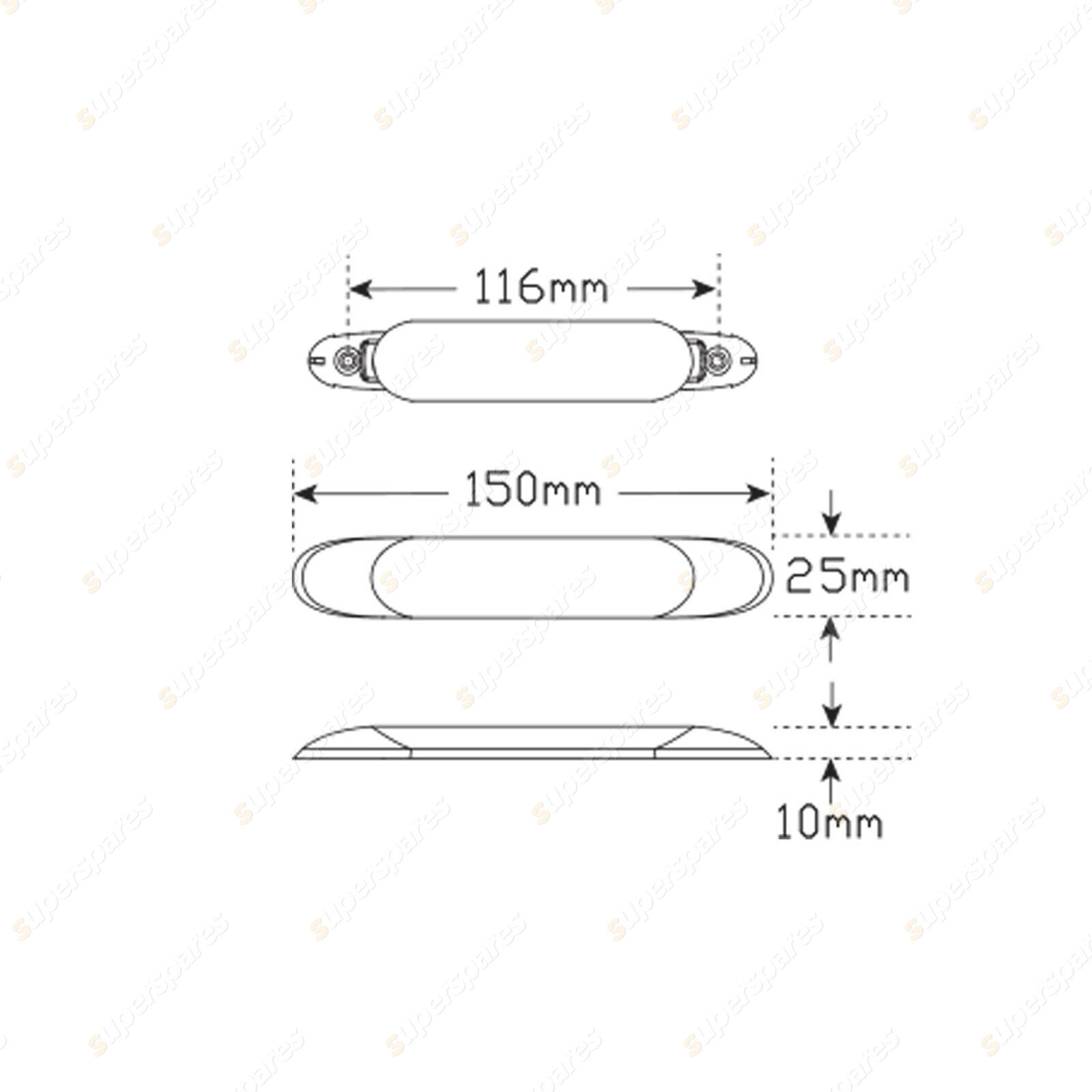 LED interior light. 24 Volt. 31pcs SMD Leds equivalent to 15 watt globe. Clear lens with White frame. 150 x 25 x 10mm. Blister Pack.
