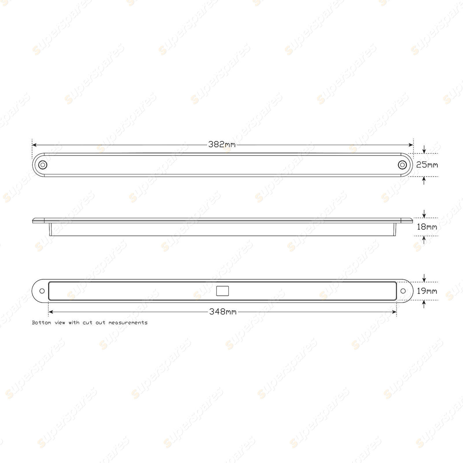Sequential Indicator Strip Lamp in 12volt with 10 square LEDs, Clear Lens, Recessed mount with 40cm hardwired. Size: 380 x 25 x 18mm. ECE Approved, Blister Packaging