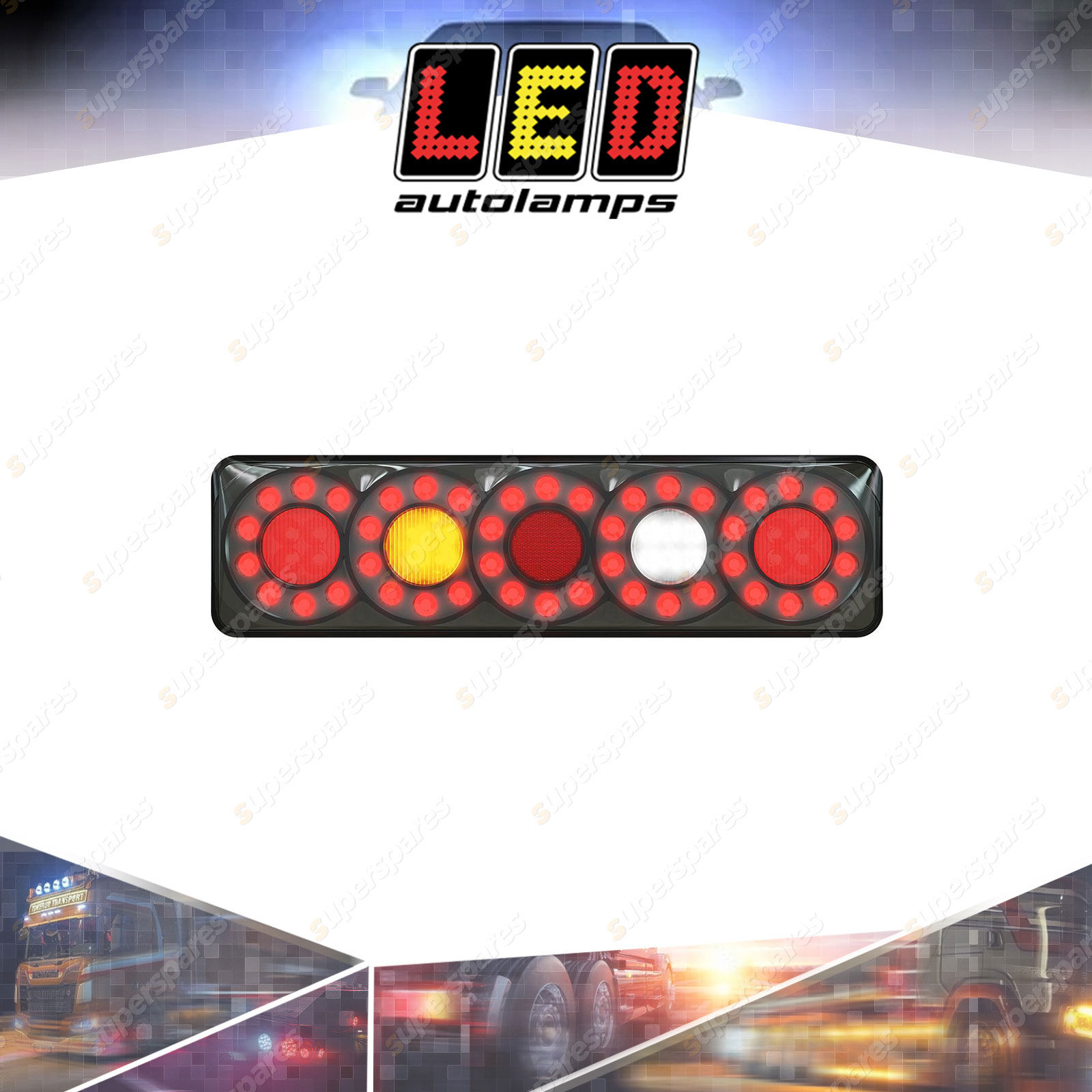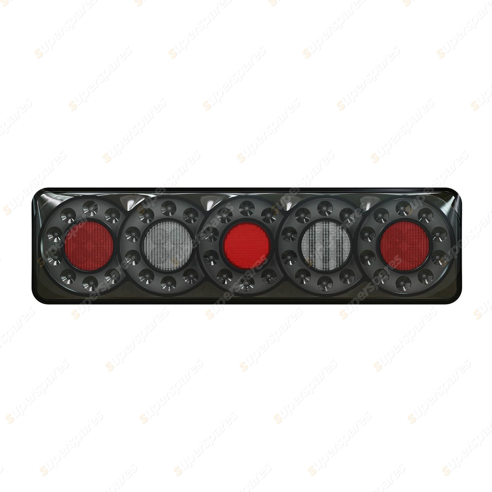 RHS Stop/Tail/Ind/Rev, 5 circle pattern tail light, black chrome with tinted lens, Multivolt, 387 x 105 x 30.5mm, ECE, white box