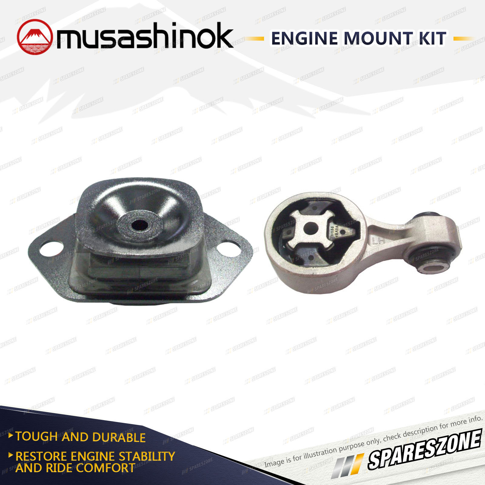 ![]() | About Engine Mounts : Musashinok engine mounts are manufactured to OE standard and very high quality, which is vital given the additional pressure on today's engine mounts.The Musashinok Engine Mount range sets new standards for quality whether manufactured in rubber or urethane.Musashinok's unique urethane design provides rubber-like smoothness and combined with urethanes durability, gives an added advantage over similar products manufactured with rubber. This makes them an ideal product for use in taxis and other commercial fleets. |