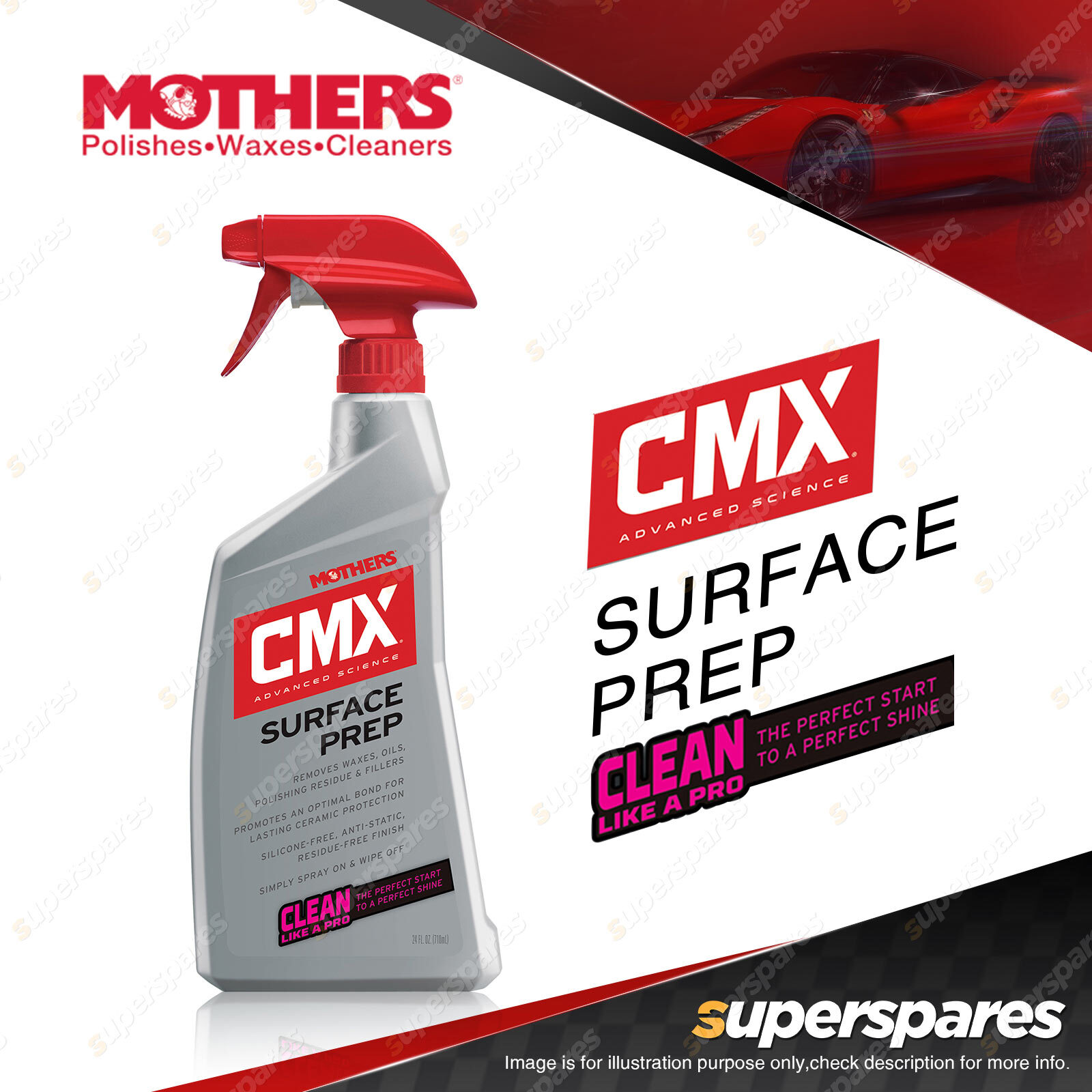 Content : 1 x Mothers CMX Surface Prep 710ML Description: Shake well before and during use.Finish should be clean and cool.Coat one area at a time,working in small sections. 1.Spray Mothers® CMX® Surface Prep onto a small area. PRO TIP: When performing paint correction,CMX® Surface Prep can be used to remove any polishing residue,oils or fillers,allowing you to assess your progress,revealing any hidden scratches,swirls or blemishes that may require further correction. ![]()