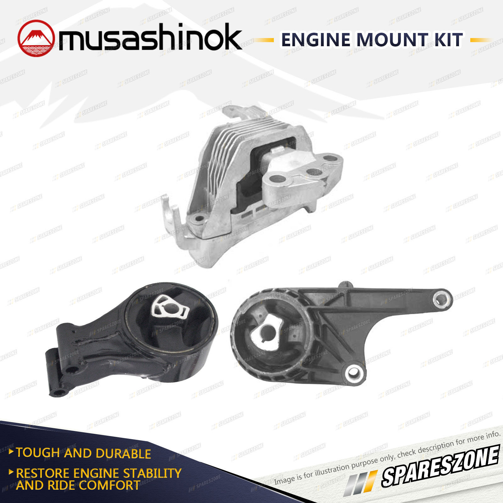 ![]() | About Engine Mounts : Musashinok engine mounts are manufactured to OE standard and very high quality, which is vital given the additional pressure on today's engine mounts.The Musashinok Engine Mount range sets new standards for quality whether manufactured in rubber or urethane.Musashinok's unique urethane design provides rubber-like smoothness and combined with urethanes durability, gives an added advantage over similar products manufactured with rubber. This makes them an ideal product for use in taxis and other commercial fleets. |