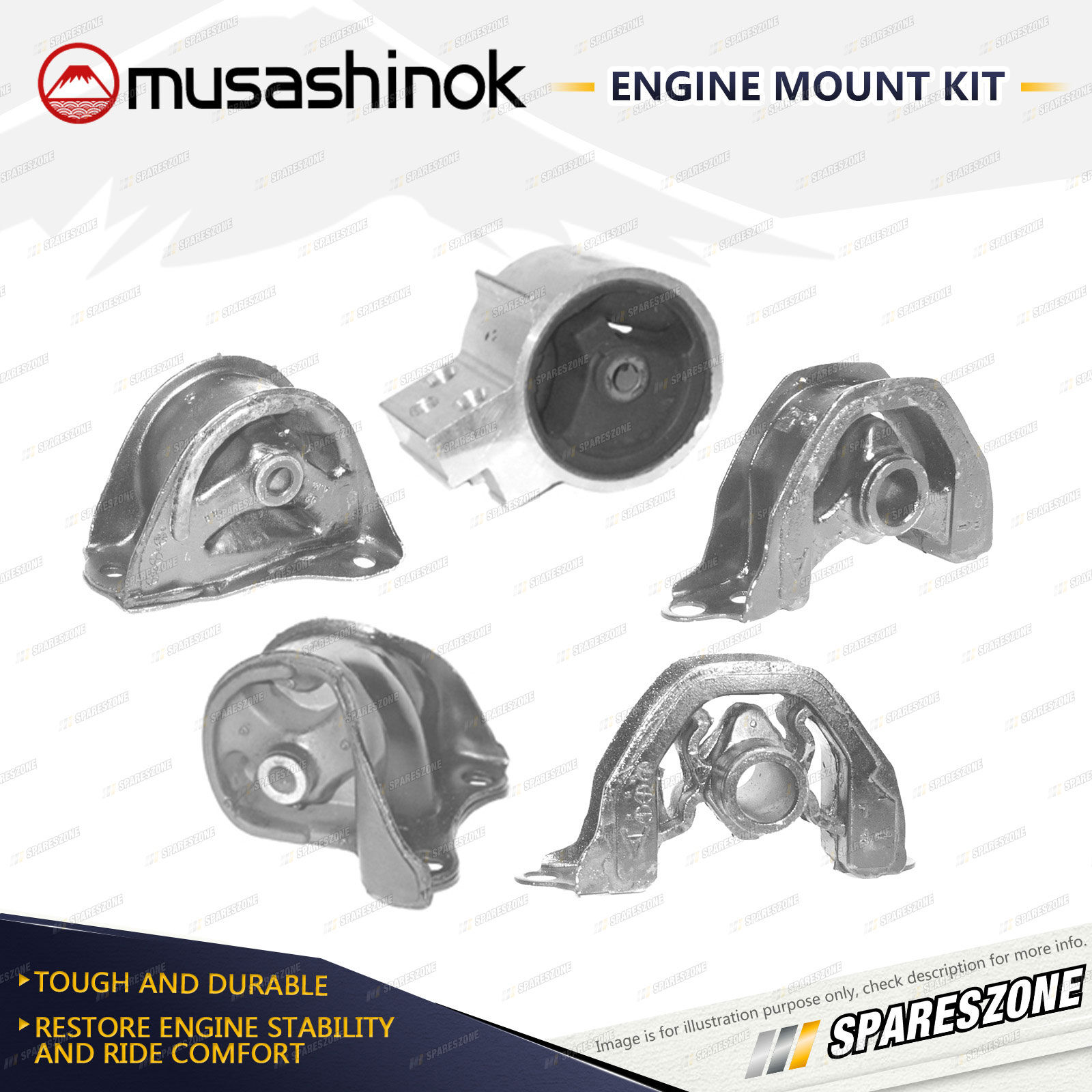 ![]() | About Engine Mounts : Musashinok engine mounts are manufactured to OE standard and very high quality, which is vital given the additional pressure on today's engine mounts.The Musashinok Engine Mount range sets new standards for quality whether manufactured in rubber or urethane.Musashinok's unique urethane design provides rubber-like smoothness and combined with urethanes durability, gives an added advantage over similar products manufactured with rubber. This makes them an ideal product for use in taxis and other commercial fleets. |