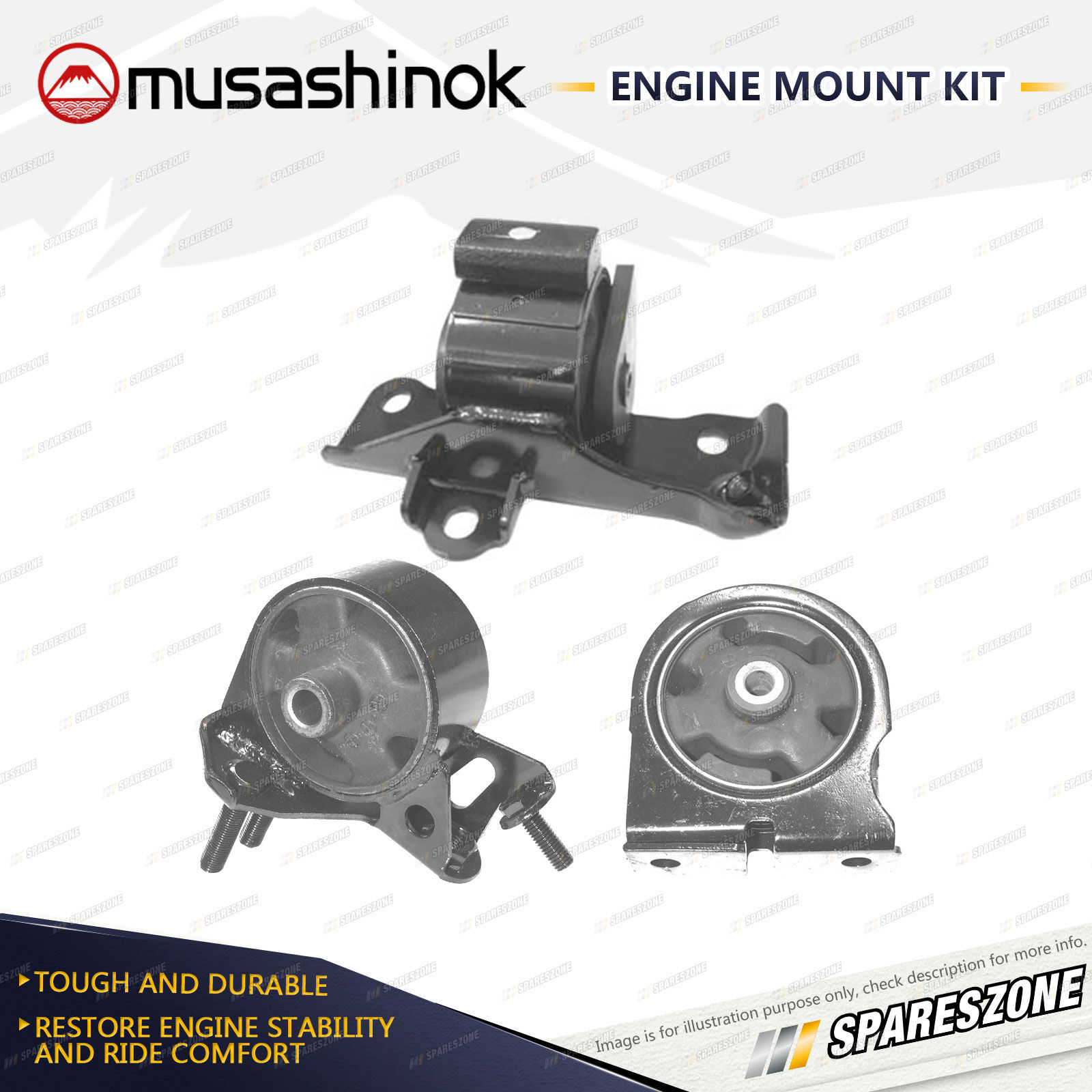 ![]() | About Engine Mounts : Musashinok engine mounts are manufactured to OE standard and very high quality, which is vital given the additional pressure on today's engine mounts.The Musashinok Engine Mount range sets new standards for quality whether manufactured in rubber or urethane.Musashinok's unique urethane design provides rubber-like smoothness and combined with urethanes durability, gives an added advantage over similar products manufactured with rubber. This makes them an ideal product for use in taxis and other commercial fleets. |