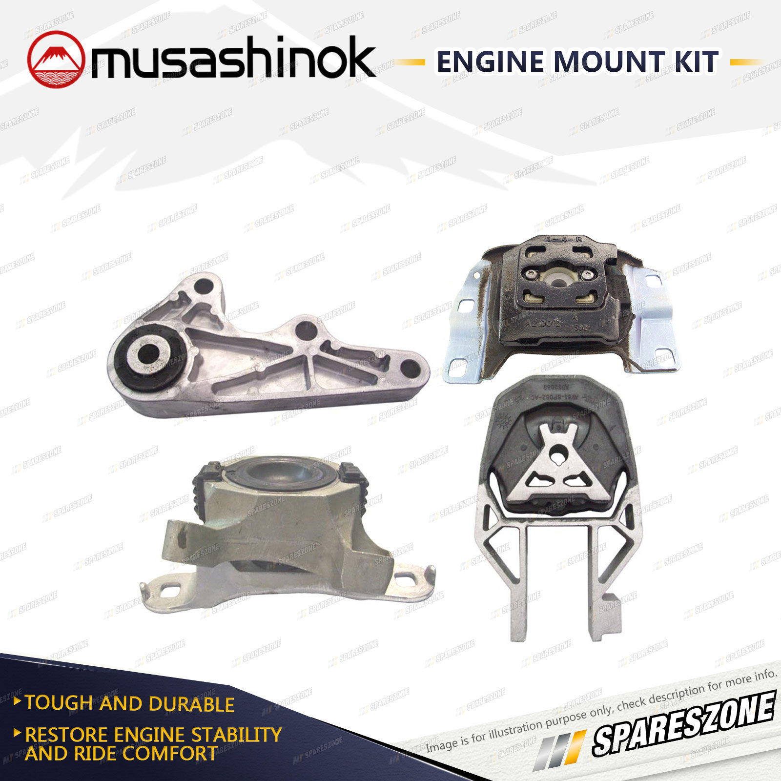 ![]() | About Engine Mounts : Musashinok engine mounts are manufactured to OE standard and very high quality, which is vital given the additional pressure on today's engine mounts.The Musashinok Engine Mount range sets new standards for quality whether manufactured in rubber or urethane.Musashinok's unique urethane design provides rubber-like smoothness and combined with urethanes durability, gives an added advantage over similar products manufactured with rubber. This makes them an ideal product for use in taxis and other commercial fleets. |