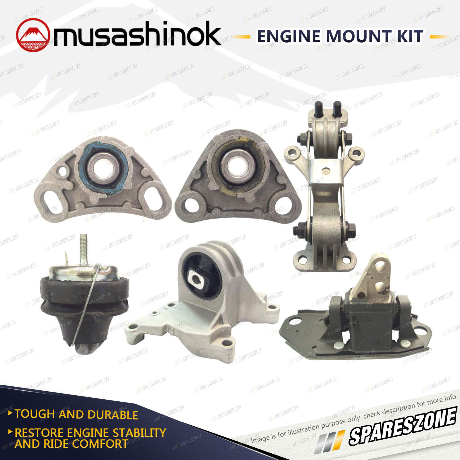 ![]() | About Engine Mounts : Musashinok engine mounts are manufactured to OE standard and very high quality, which is vital given the additional pressure on today's engine mounts.The Musashinok Engine Mount range sets new standards for quality whether manufactured in rubber or urethane.Musashinok's unique urethane design provides rubber-like smoothness and combined with urethanes durability, gives an added advantage over similar products manufactured with rubber. This makes them an ideal product for use in taxis and other commercial fleets. |