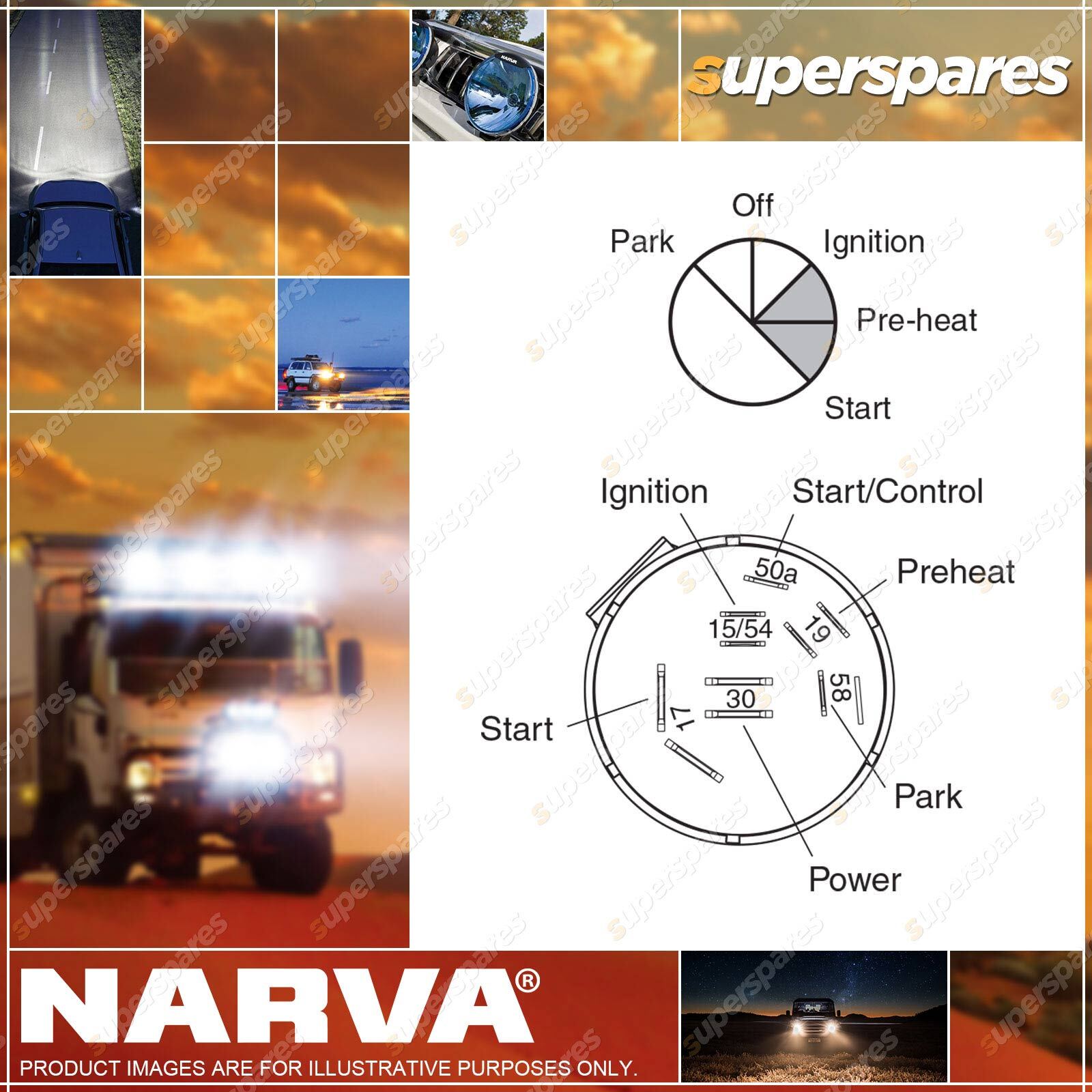 Amperage ratings at 12V, 8A Park Lamp, 35A Ignition, 60A Pre-heat, 60A Start