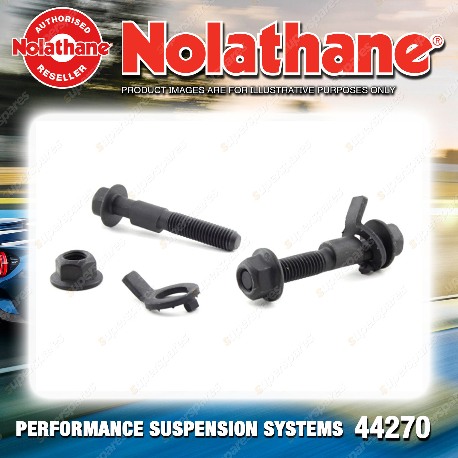 | Contents : Nolathane Front Camber adjusting - bolt Warranty : 3 Year / 60,000Kms Kit Contents : 2 Bolts, Install Guide |