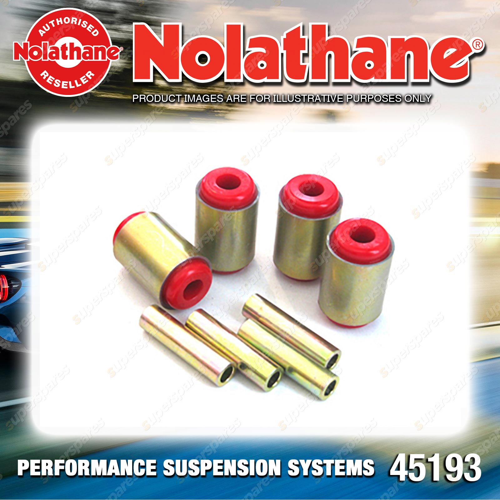 | Contents : Nolathane Front Control arm - lower inner bushing Warranty : 3 Year / 60,000Kms Kit Contents : 4 Shell Bushings, 4 Tubes, Grease |
