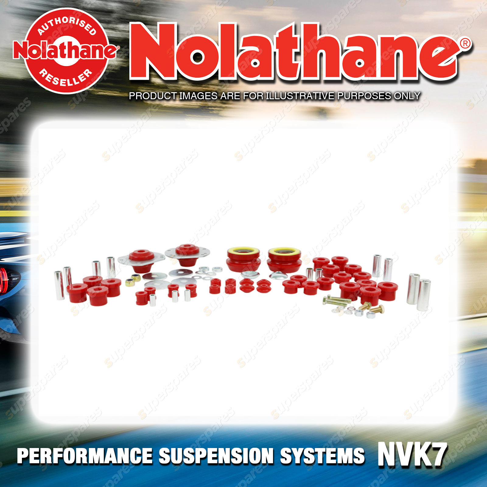 Nolathane Front Control arm - lower inner bushing Nolathane Front Strut rod - to chassis bushing Nolathane Front Strut rod - to control arm bushing Nolathane Front Strut mount - bushing Nolathane Front Sway bar - link bushing Nolathane Rear Control arm - inner and outer bushing Nolathane Rear Sway bar - link bushing Warranty : 3 Year / 60,000Kms Kit Contents : 32 Bushings, 2 Mounts, 2 Bearings, 14 Tubes, 4 Bolts, 12 Washers, 2 Nuts, Grease |