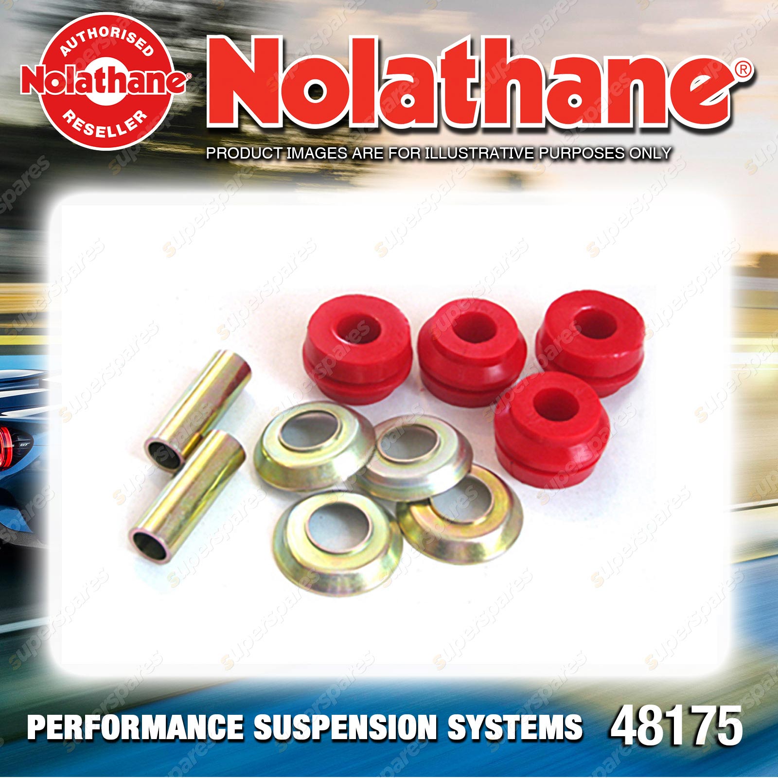 | Contents : Nolathane Front Strut rod - to chassis bushing Warranty : 3 Year / 60,000Kms Kit Contents : 4 Bushings, 2 Tubes, 4 Washers, Grease |