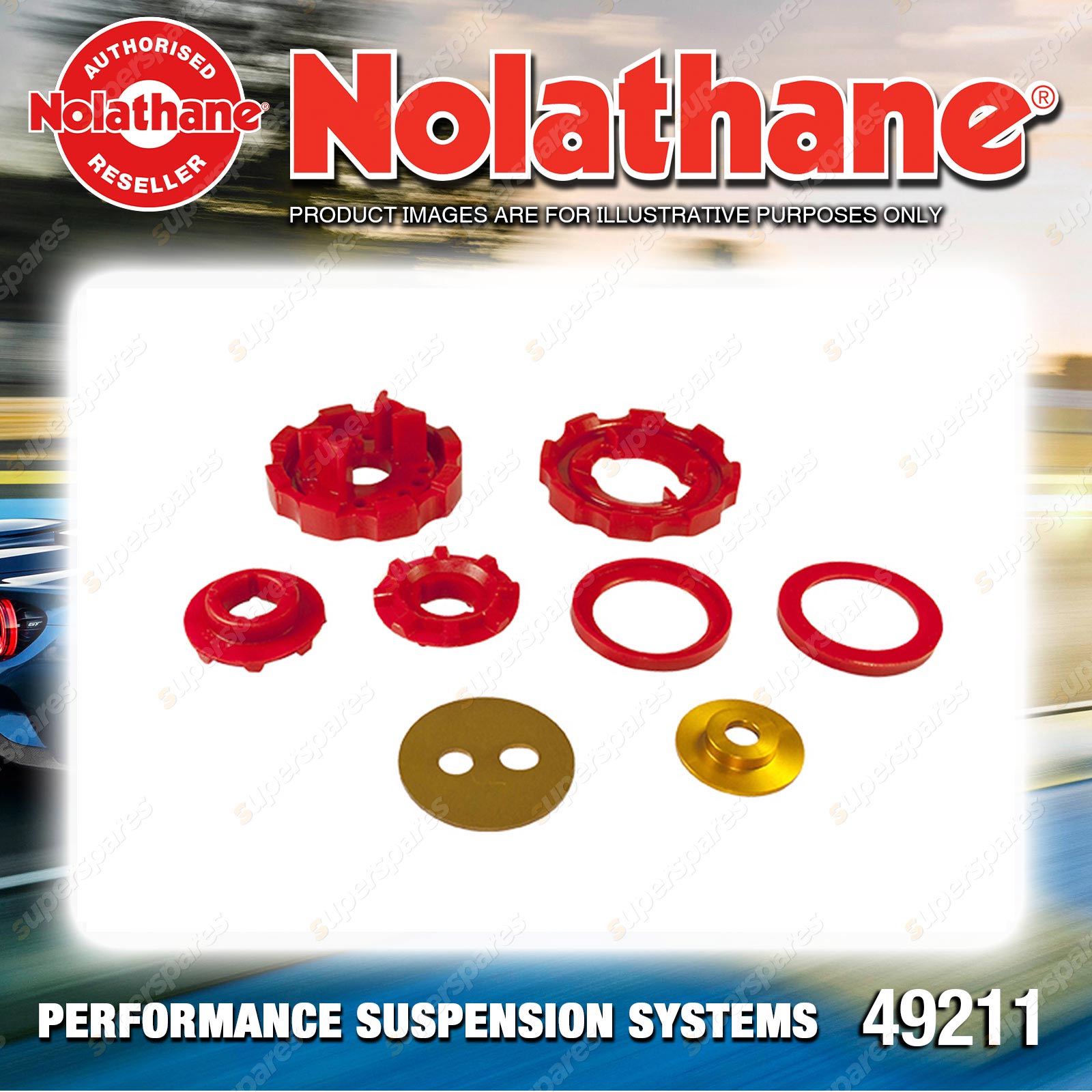 | Contents : Nolathane Rear Differential - mount bushing Warranty : 3 Year / 60,000Kms Kit Contents : 6 Insert Bushings, 2 Washers, Install Guide, Grease |