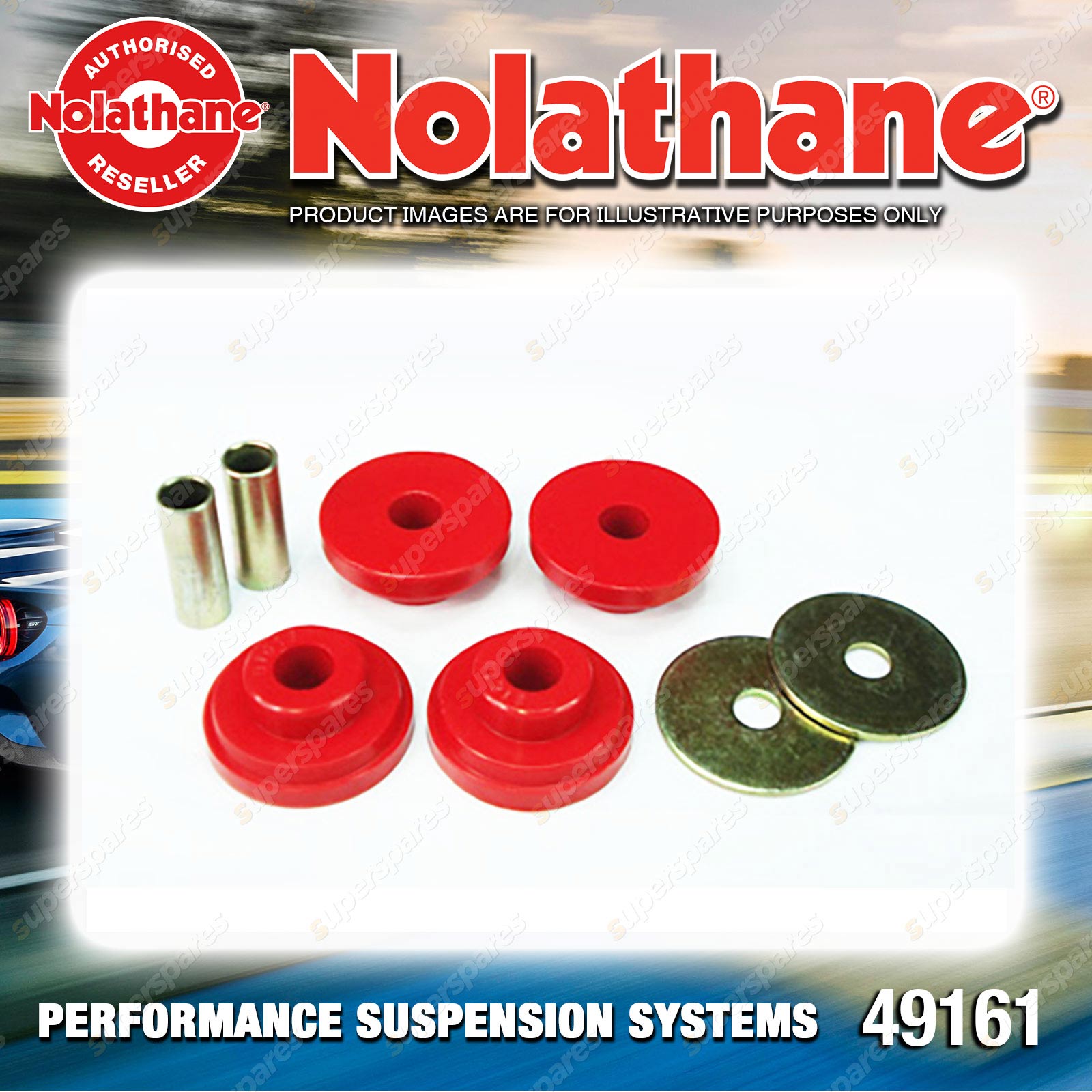 | Contents : Nolathane Rear Differential - mount support front bushing Warranty : 3 Year / 60,000Kms Kit Contents : 4 Bushings, 2 Tubes, 2 Washers, Grease |