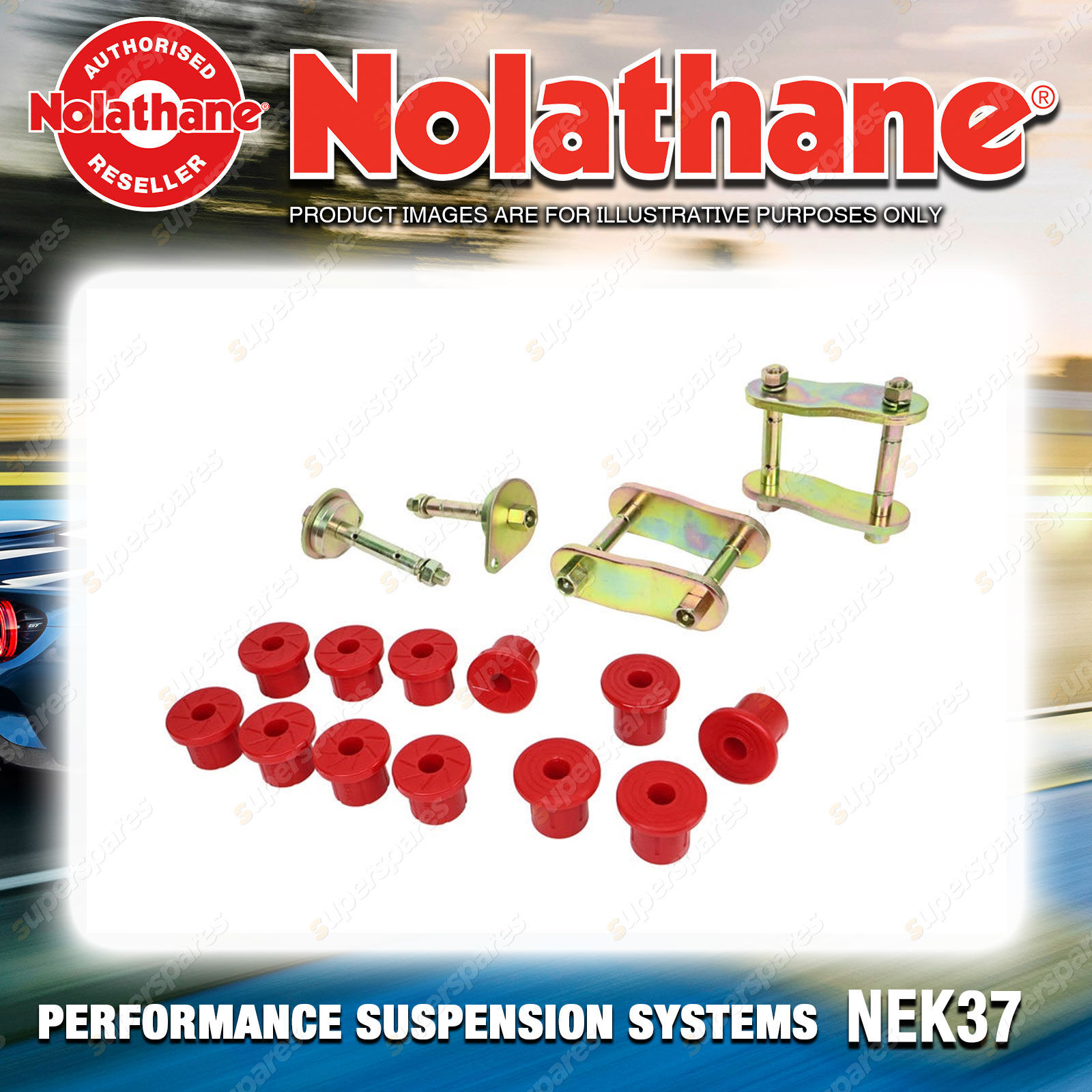Contents : Nolathane Leaf Spring - Bushing and Greaseable Shackle/Pin Kit Position : Rear Warranty : 3 Year / 60,000Kms Kit Contents : 2 Shackles, 2 Pins, 12 Bushings, 2 Tubes |