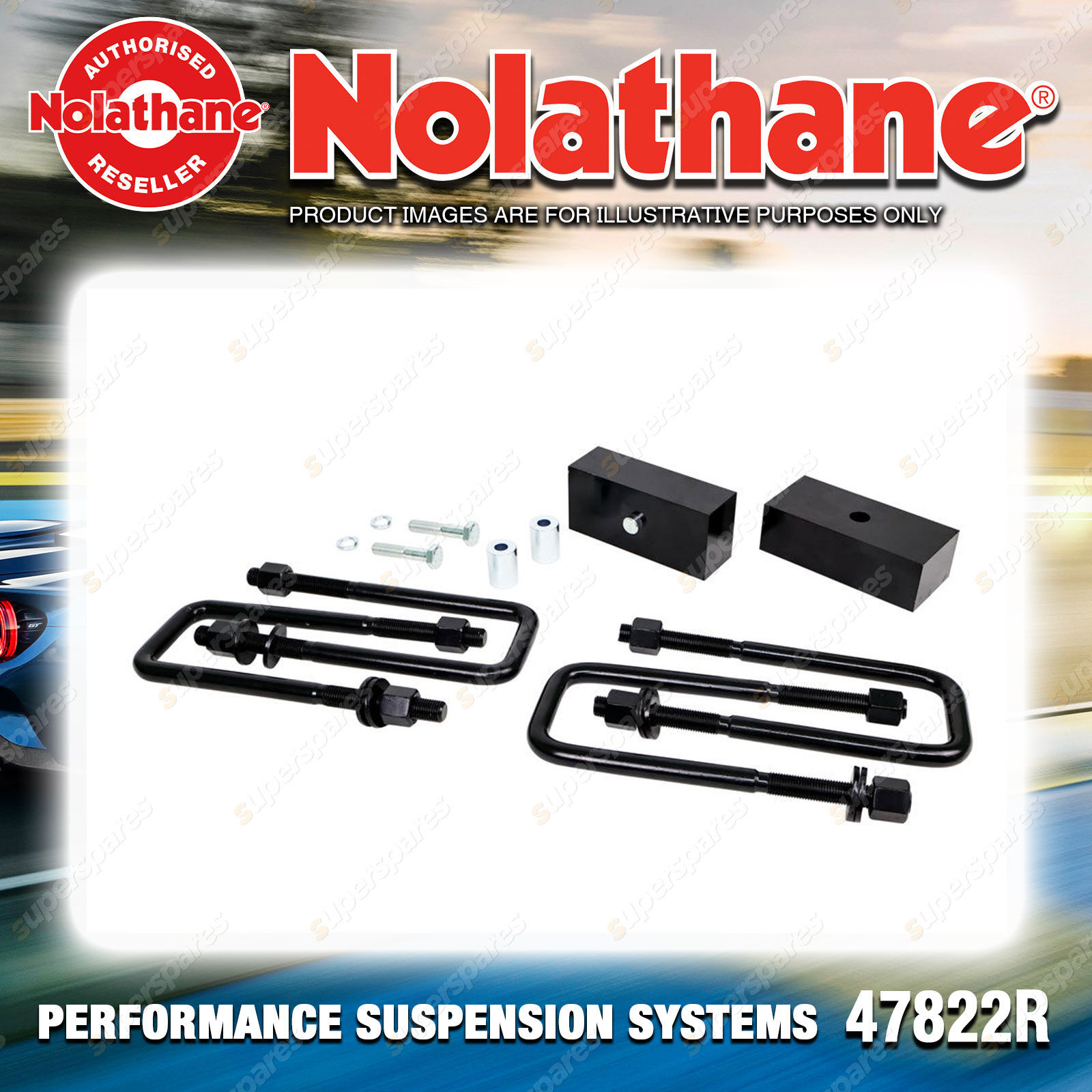 Contents : Nolathane Lift Kit - Spacer Block Position : Rear Warranty : Lifetime Kit Contents : 2 Blocks, 4 U-Bolts, Hardware |