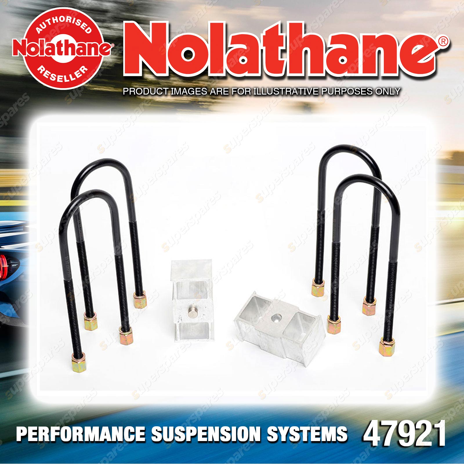 | Contents : Nolathane Rear Lowering block - kit Warranty : 3 Year / 60,000Kms Kit Contents : 2 Blocks, 4 U-Bolts, 4 Washers, 4 Nuts, Install Guide |