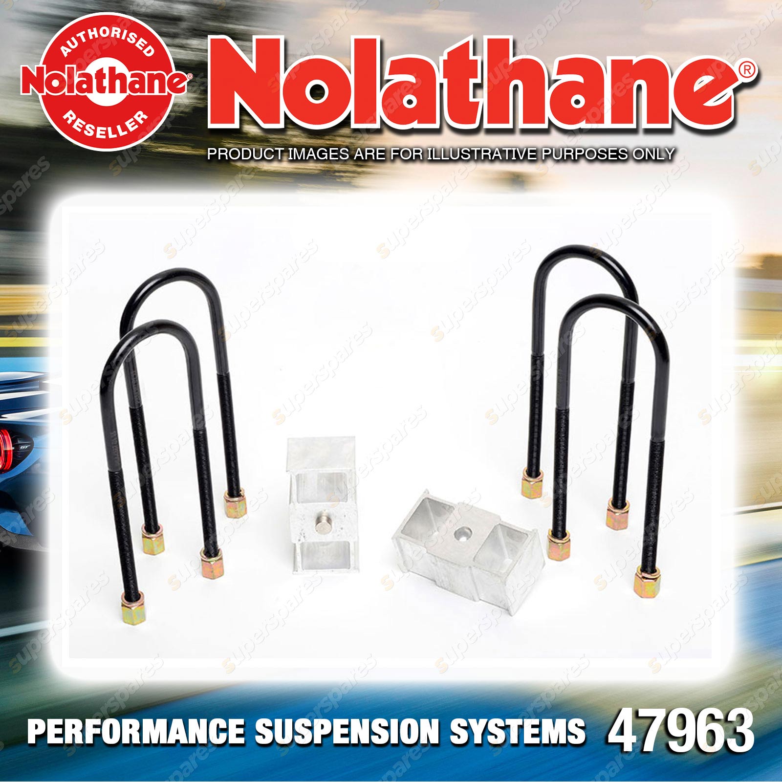 | Contents : Nolathane Rear Lowering block - kit Warranty : 3 Year / 60,000Kms Kit Contents : 2 Blocks, 4 U-Bolts, 4 Washers, 4 Nuts, Install Guide |