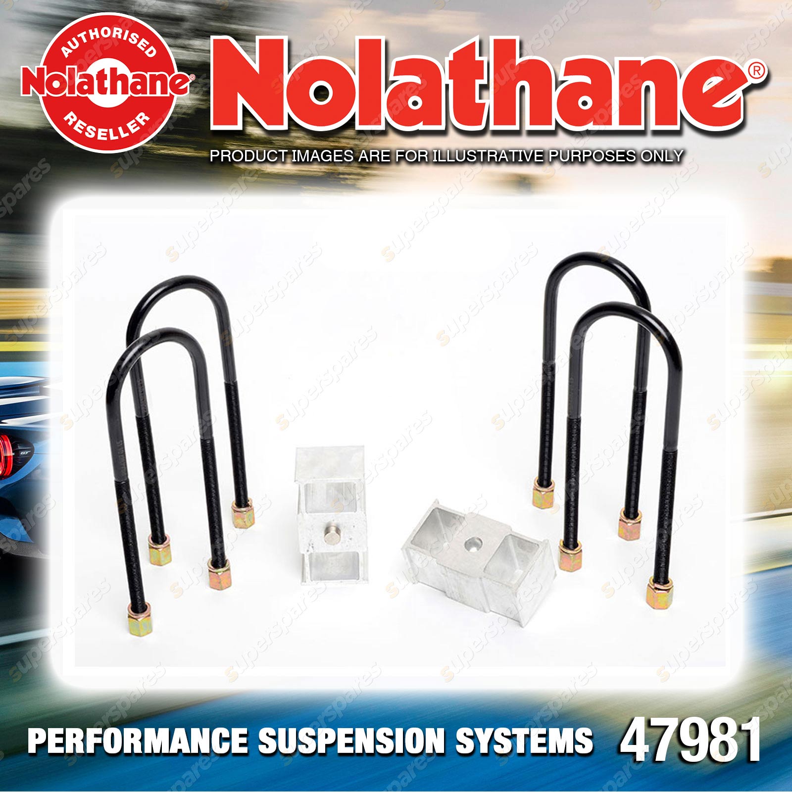 | Contents : Nolathane Rear Lowering block - kit Warranty : 3 Year / 60,000Kms Kit Contents : 2 Blocks, 4 U-Bolts, 4 Washers, 4 Nuts, Install Guide |