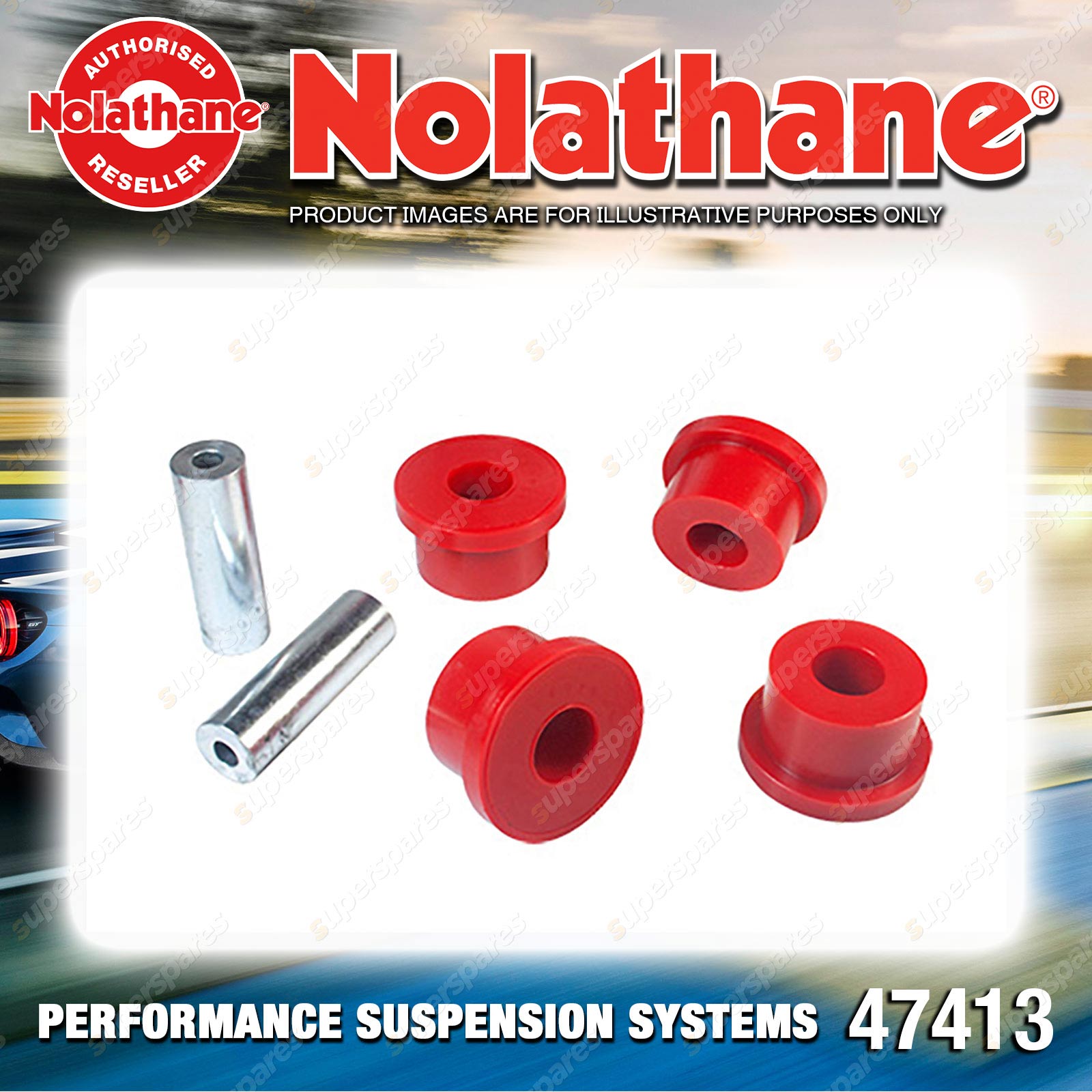 | Contents : Nolathane Rear Spring - eye front bushing Warranty : 3 Year / 60,000Kms Kit Contents : 4 Bushings, 2 Tubes, Grease |
