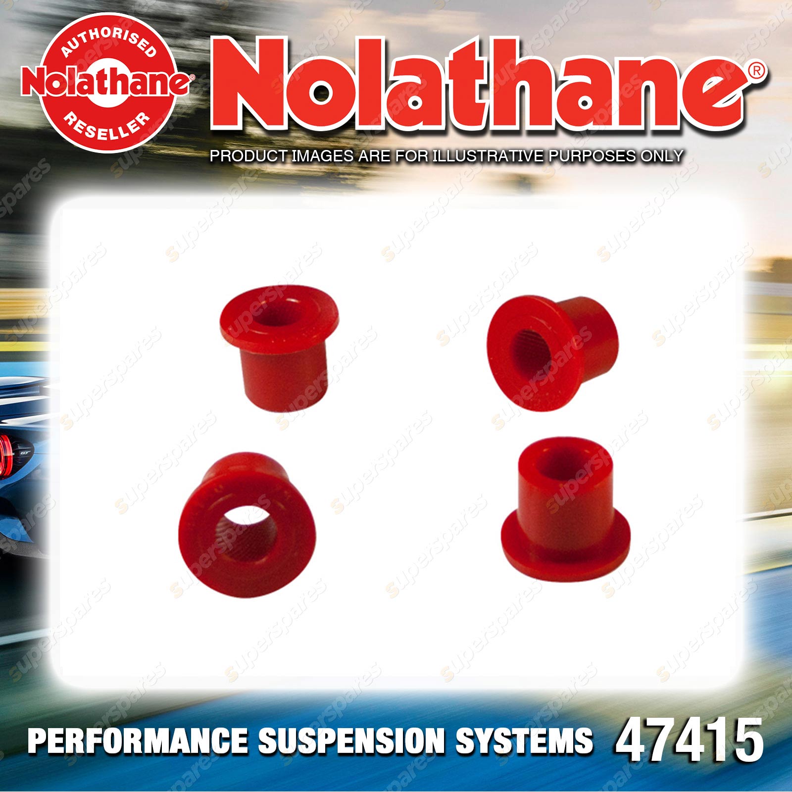 | Contents : Nolathane Rear Spring - eye rear bushing Warranty : 3 Year / 60,000Kms Kit Contents : 4 Bushings, Grease |