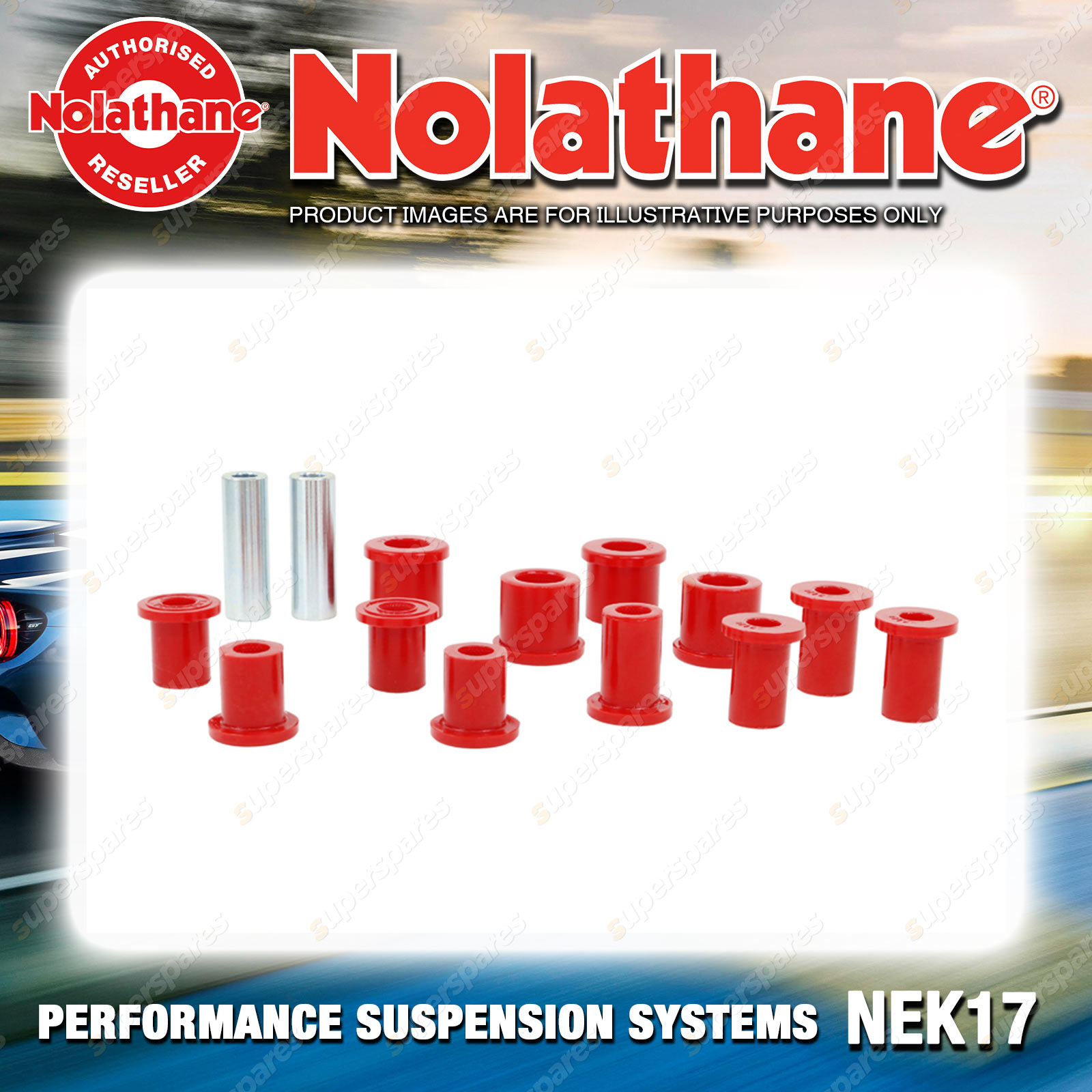 Nolathane Rear Spring - eye front bushing Nolathane Rear Spring - eye front and rear bushing Nolathane Rear Spring - shackle bushing Warranty : 3 Year / 60,000Kms Kit Contents : 12 Bushings, 2 Tubes, Grease |