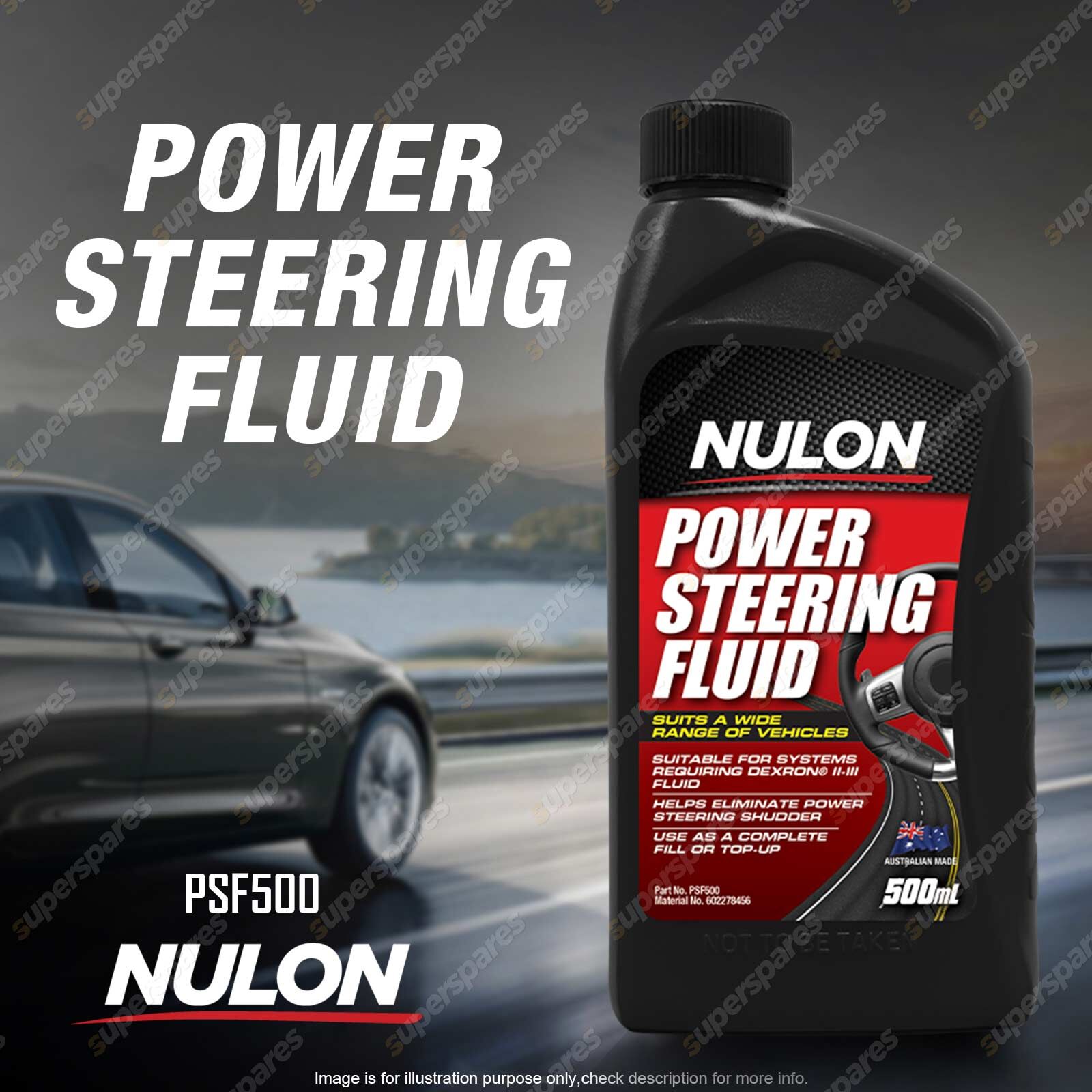 Nulon Power Steering Fluid (PSF) is a mineral based fluid that has been formulated to suit all power steering systems that require a Dexron® fluid. Nulon PSF contains enhanced anti-corrosion and anti wear additives to ensure optimum protection. It is an excellent everyday choice for Australian conditions. Power steering systems are generally very reliable and failures are rare, so preventative maintenance is often neglected. Manufacturers rarely mention power steering maintenance in their service schedules. A little preventative maintenance goes a long way to ensuring trouble free operation and long service life. Inspections should be carried out at each service. Fluid level should be checked and the fluid should also be checked for cleanliness. If the fluid is dirty it should be changed, as dirt and sludge are major threats to smooth operation. Also, drive belts should be checked for condition and correct tension. Pulleys, mounting brackets and hoses should be checked for condition as well. Power steering systems typically contain only a small volume of lubricating fluid, and that fluid is subjected to quite harsh conditions, particularly heat, moisture and contamination. Periodically removing old, dirty and degraded power steering fluid and replenishing it with Nulon Power Steering Fluid will significantly extend the life of the entire power steering system. |