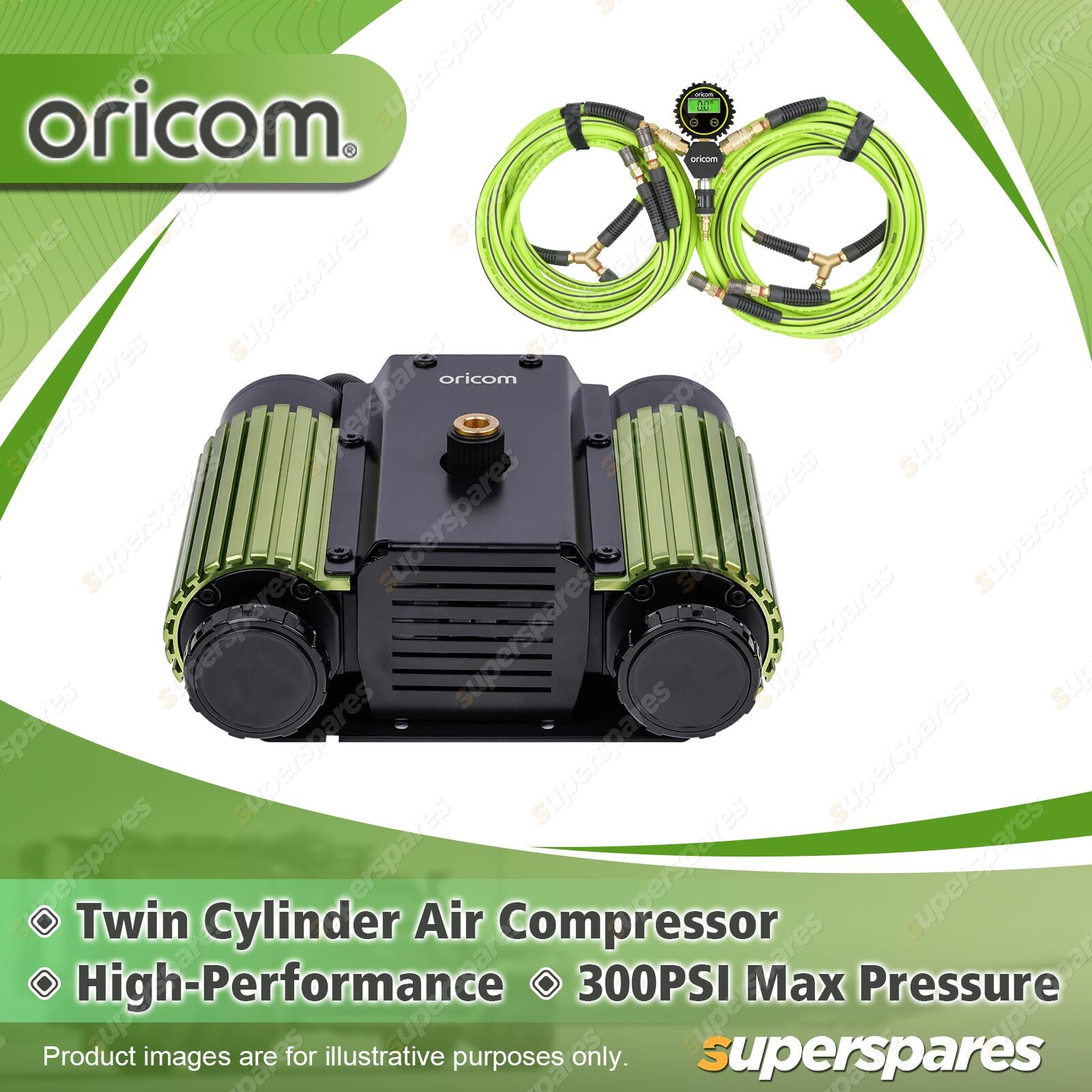 Contents: 1 x Oricom Twin Cylinder Air Compressor Kit Pack Includes: