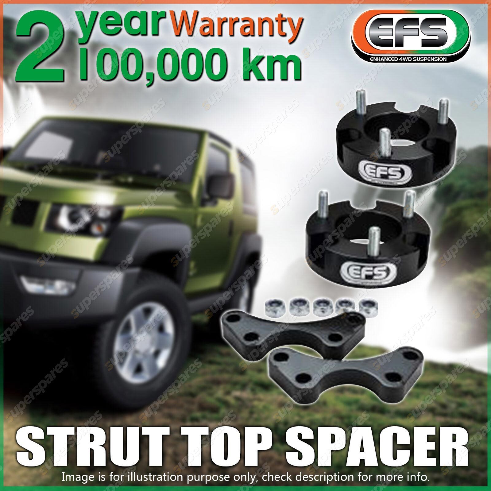 Contents: Pair Front EFS Strut Top Spacers - 50mm lift (APPROX) Suit: Holden Colorado 2012+ Chevy