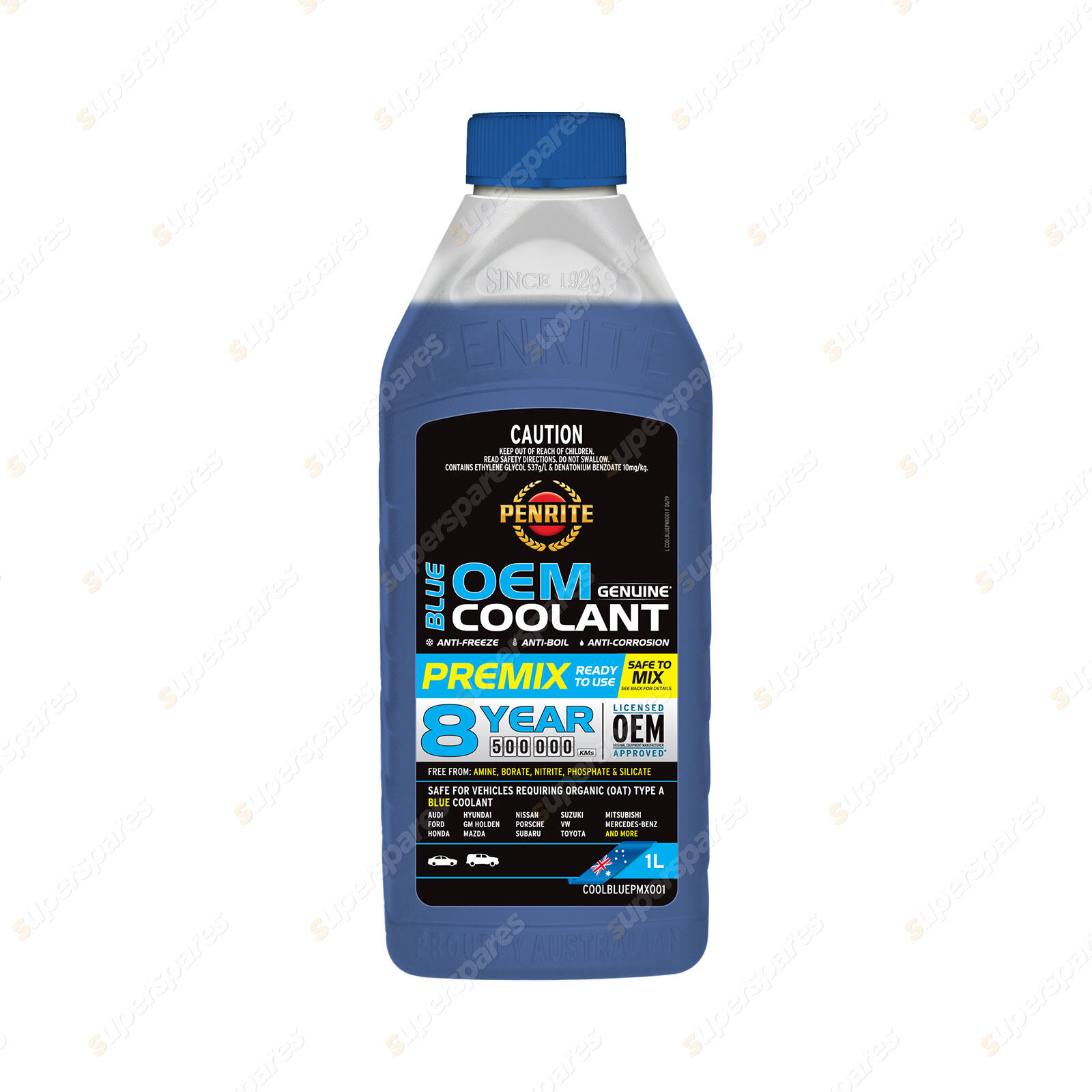 Blue OEM Coolant Premix Coolant is suitable for passenger cars, 4WD's, motorcycles, light & heavy duty commercial vehicles, construction and agricultural equipment. It is suitable for use with Australian, European, Asian & US vehicles It is Silicate, Borate and Phosphate Free making it particularly suitable for both European & Japanese vehicles that use blue coloured coolant such as Nissan, Subaru & Suzuki.