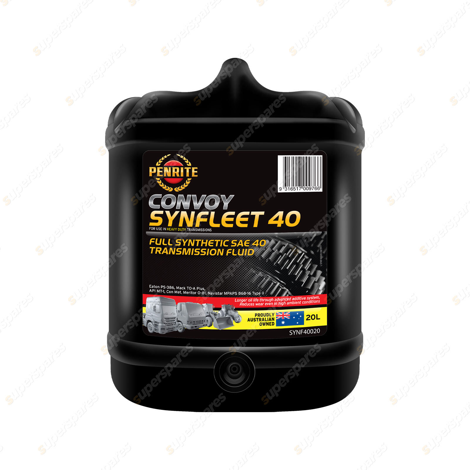 Convoy Synfleet 40 is designed for use in heavy duty transmissions in on and off highway applications. Specially formulated to protect higher torque transmissions coupled with increased horsepower engines. It is recommended where low temperatures, wear or heat present major problems and a non-EP lubricant is required. It can be used in transmissions, transfer cases and wheel end hubs.