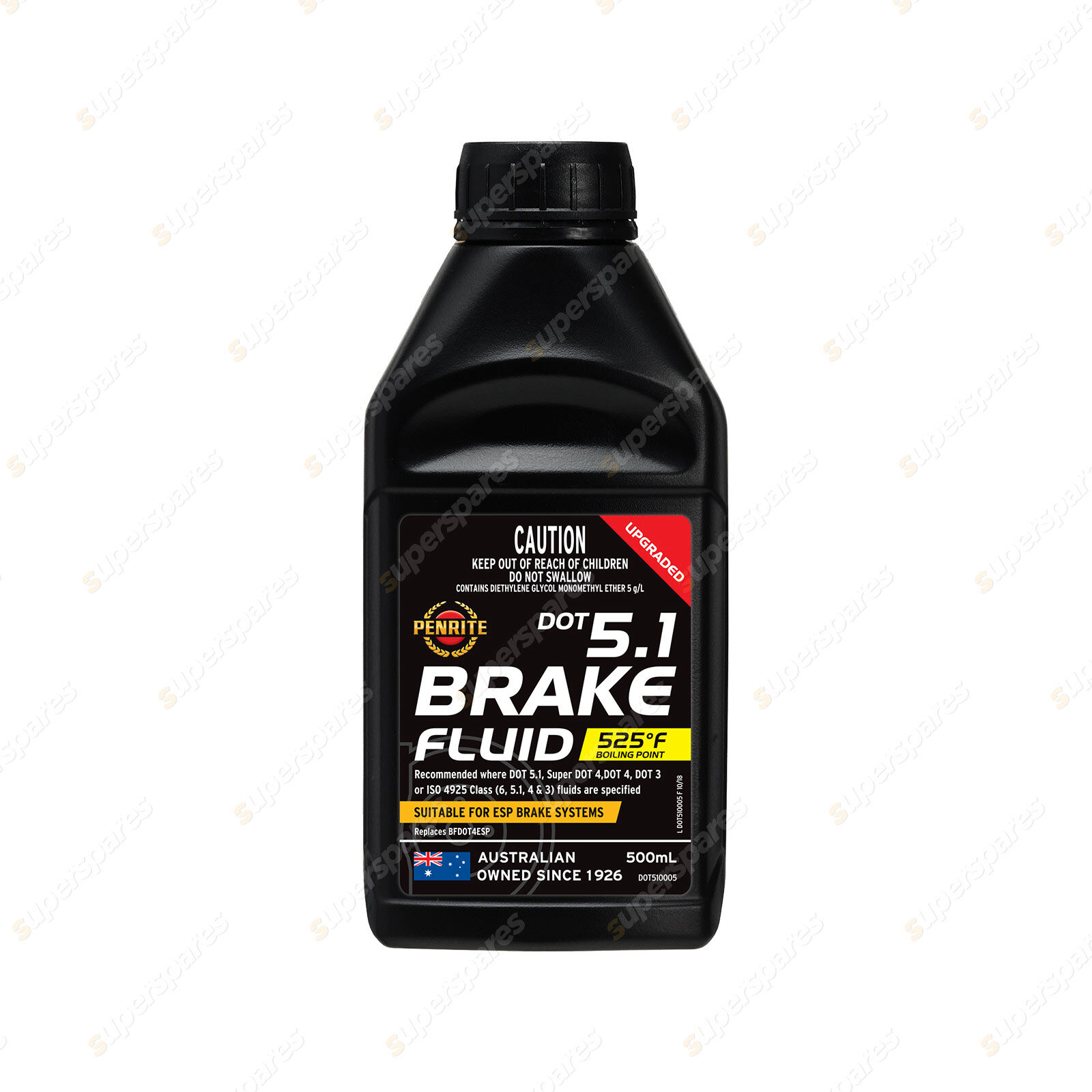 DOT 5 .1 Brake Fluid is a premium quality, full synthetic , non-silicone, DOT 5.1 brake fluid designed for use in a wide range of brake and clutch Applications. It can also be used in vehicles with ABS (Anti Brake Skid), AEB (Auto Emergency Braking) and ESP (Electronic Stability Program) systems where Penrite Brake Fluid DOT 4 ESP was previously used.