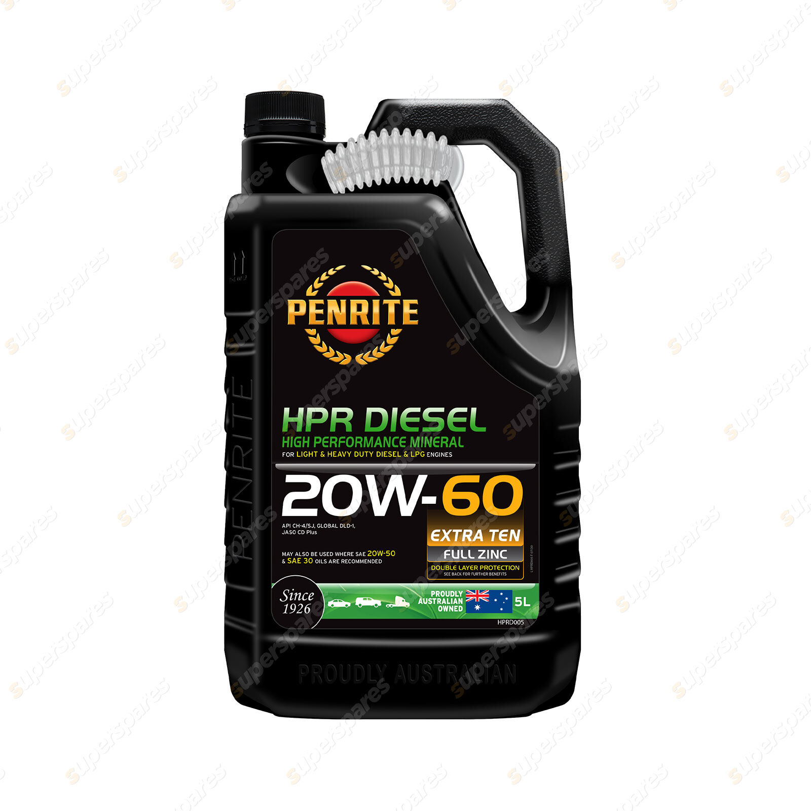 HPR Diesel is a premium high performance mineral SAE 20W-60, non- friction modified engine oil. It features a DOUBLE LAYER of engine wear protection with FULL ZINC and Penrites advanced EXTRA TEN technology. It contains a combination of high technology additives , including increased dispersant levels and low shear viscosity modifiers. It protects against corrosion, oil oxidation and sludge under all operating conditions.