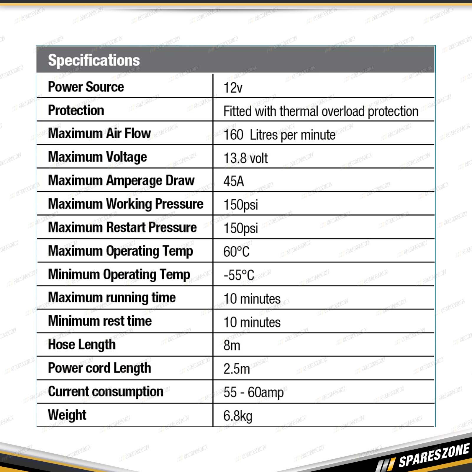 Contents : 1 x Pro-Tyre 12V 150psi Heavy Duty Air Compressor - 160LPM & 8m Solid Rubber Hose