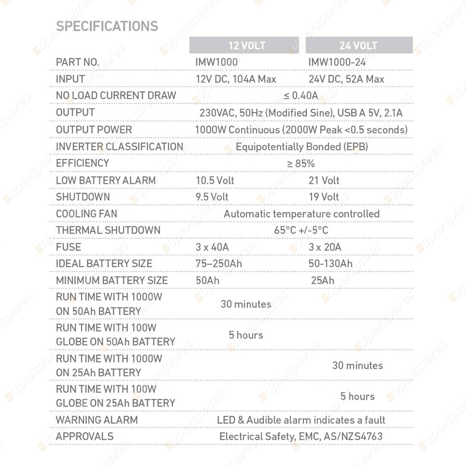 Contents : Projecta 1000W 12V Modified Sine Wave Inverter