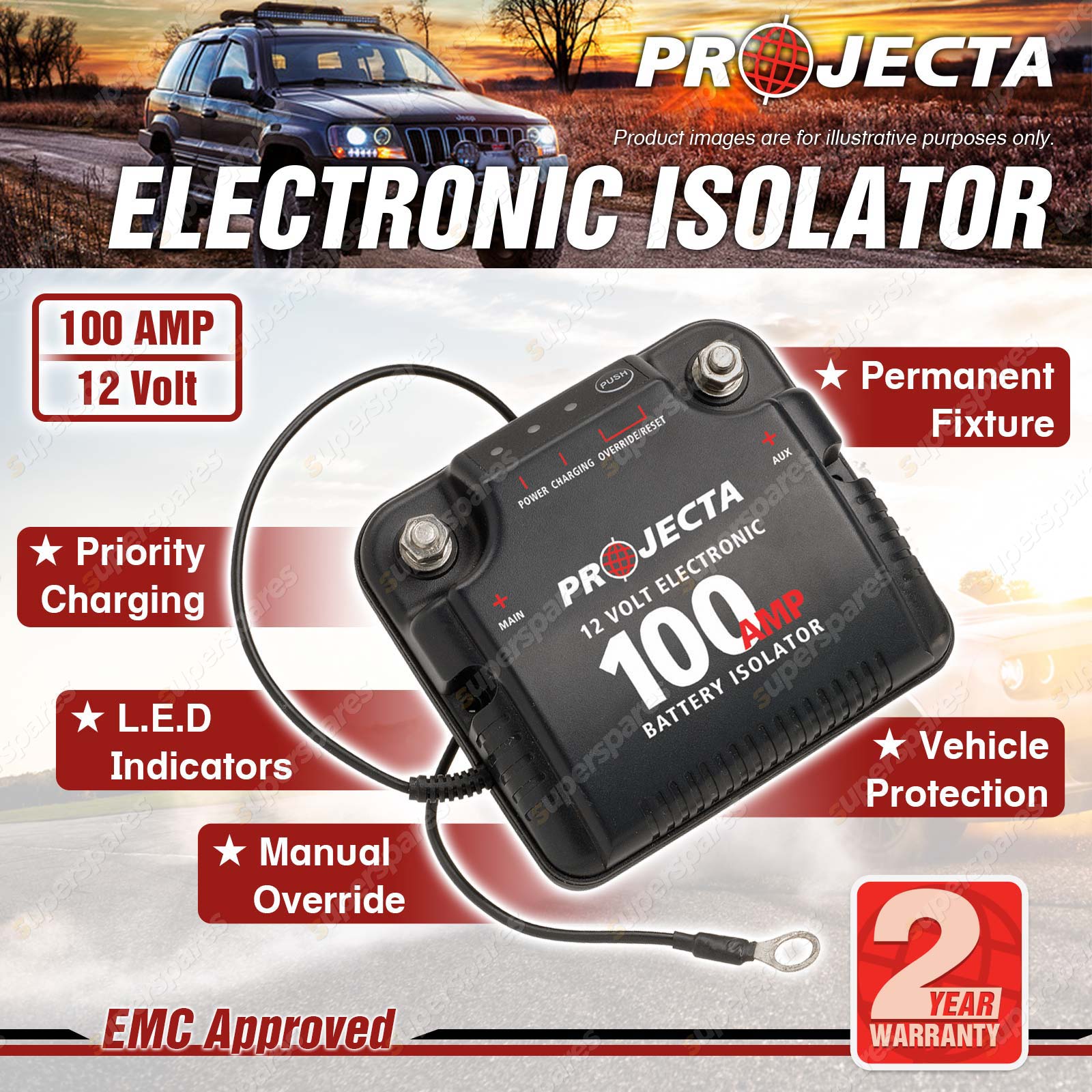 Projecta offers a comprehensive range of battery isolators to suit a variety of applications and budgets, ideal for recreational vehicles, utility vehicles, boats and trucks. Starting with our robust and in-field proven voltage sensitive relays, ideal for running and controlling multiple loads through to our top selling sophisticated range of fully automatic electronic isolators. Each isolator is available as a single unit as well as within a comprehensive kit which includes everything required for an easy and professional installation. The very best of materials are provided from heavy-duty cable for maximum current transfer and minimal voltage drop, high quality lugs, connectors and mounting bracketry to a fused distribution terminal supplied with high end isolators which cleverly convert the positive battery post of the auxiliary battery into 3 fused outlets. |